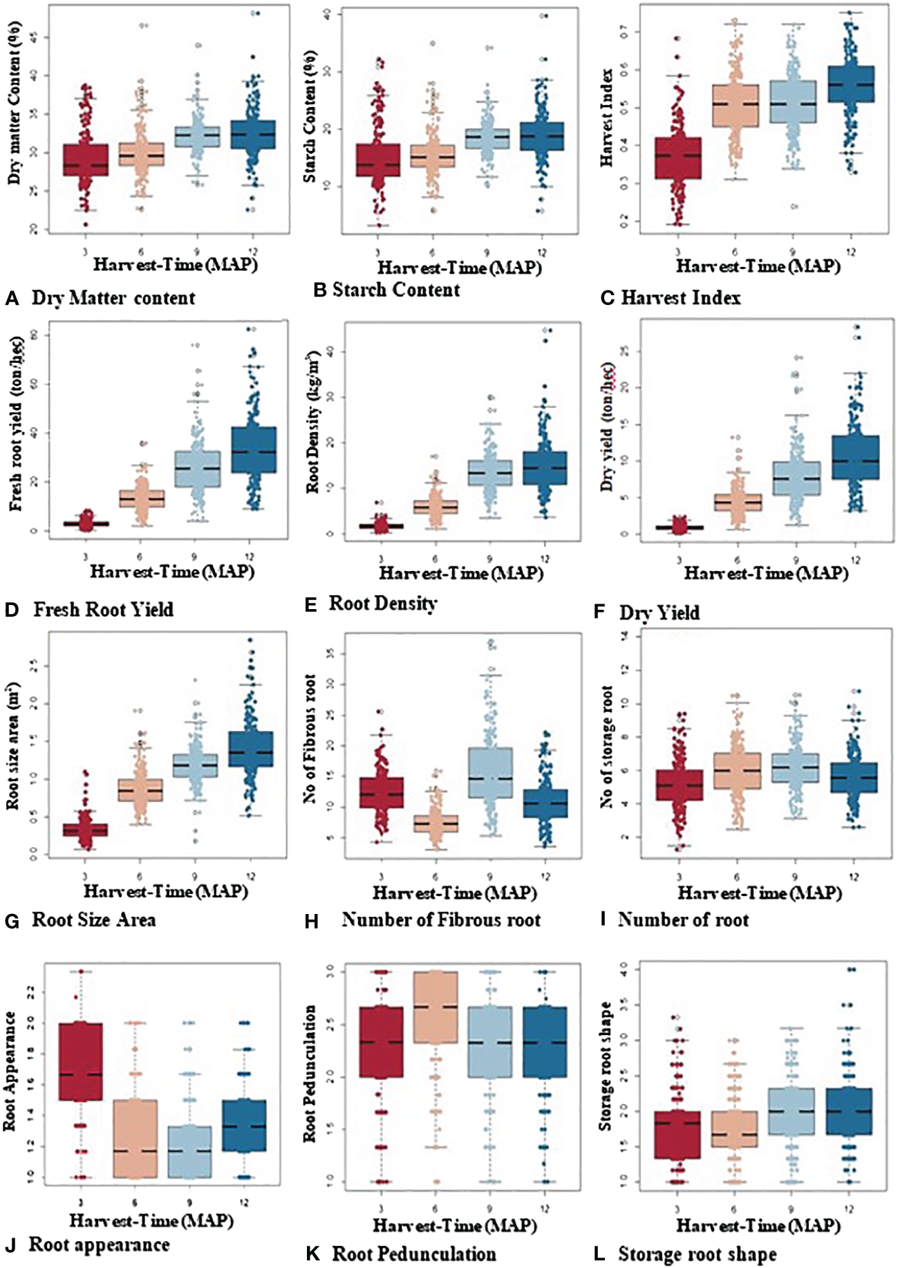 With a wider distribution of data at 9 and 12 MAP in the bulking process, fresh storage root yield (4–81 t/ha), root density (2–44 kg/m3), dry yield (1–11 t/ha), harvest index (0.2–0.75), and storage root size area (0.15–2.90 cm2) all increased over time. Although alterations from 6 and 9 MAP were more gradual, the number of storage roots exhibited a similar pattern. The skin color appearance of the roots varied according to the plant’s age. At 3 MAP, the majority of the storage roots were gray (2-scale = gray color), turned dark brown (1-scale = dark brown color), and then primarily turned light brown (1.5-scale = light brown color) at 6 and 9 MAP. Similar patterns were seen in root pedunculation (1-scale = presence of peduncle, 2-scale = sessile, and 3-scale = no peduncle), though variations at 6 MAP were more gradual and abruptly dropped to sessile at 9 and 12 MAP. At the early stages of bulking (3 to 6 MAP), root shape varied, but for the majority of genotypes, it was unaffected at 9 and 12 MAP.