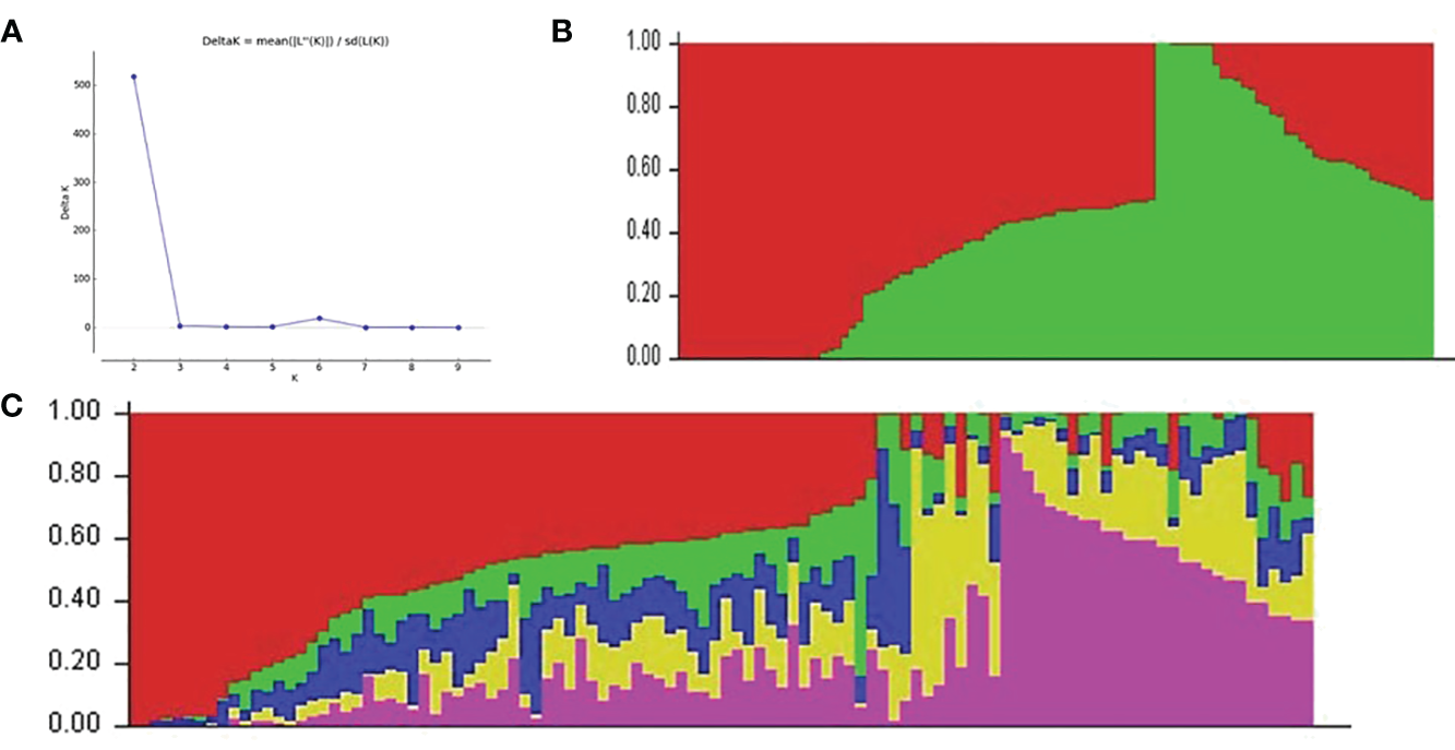 After removing biased batch-specific markers, 68,383 polymorphic SNP markers were left for use in the genetic relationship and population structure analyses. The polymorphic SNP markers were employed for the analysis of the population structure and genetic relationships based on a cut-off of 0.85.