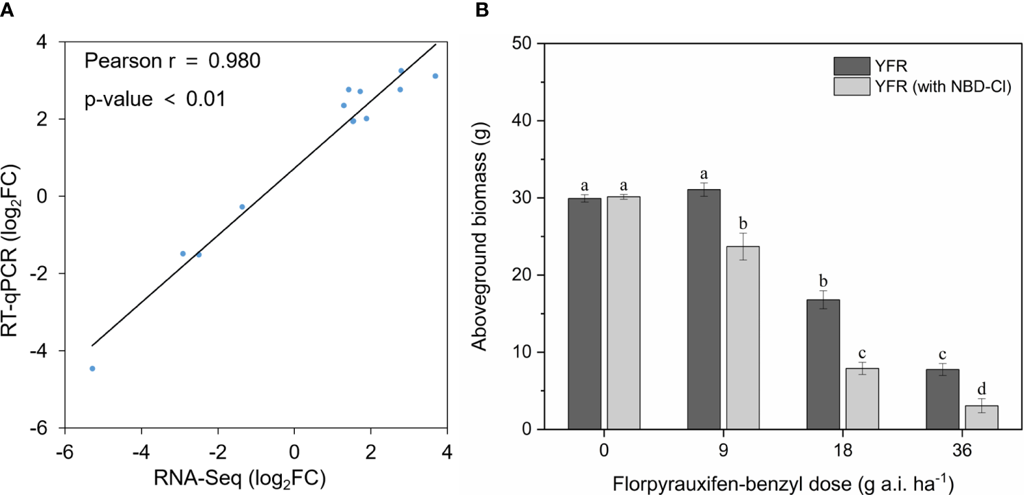 Revalidation of RNA-seq data through qPCR and verification of GST-mediated resistance via GST inhibitors. (A) The correlation between the RT-qPCR results and RNA-Seq data of selected genes. (B) The histograms of YFR’s aboveground biomass under four FPB doses with and without NBD-Cl pretreatment. Different lowercase letters above errors bar represent differences (P < 0.05) between treatments.