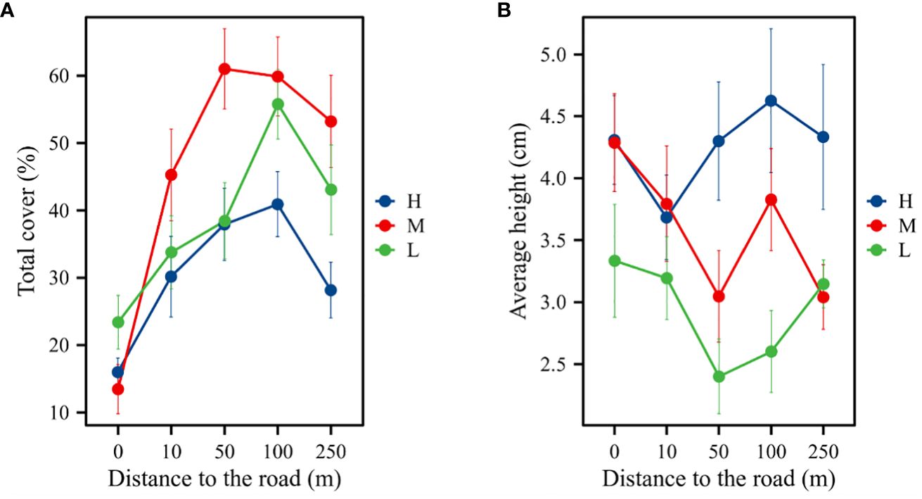 Meadows at five different distances from the road exhibited different plant community characteristics. The elevation, distance, and interaction between the two grasslands significantly affected plant community height and cover (PA = 0.462, PD< 0.001, PA × D = 0.099). At different distances from the road, vegetation cover was significantly lower at the slope (0 m) than at other distances (P< 0.05). The plant community cover of the three altitudinal gradients was unimodal with a significant increase followed by a significant decrease with increasing distance from the road (Figure 2A). Inconsistent trends were observed in plant community height at different elevations and distances (PA = 0.067, PD = 0.020). Plant community height decreased from 0 to 10 m and increased from 50 m to 100 m. The plant community heights at 50, 100, and 250 m were higher at high elevations than at the middle and low elevations (Figure 2B).