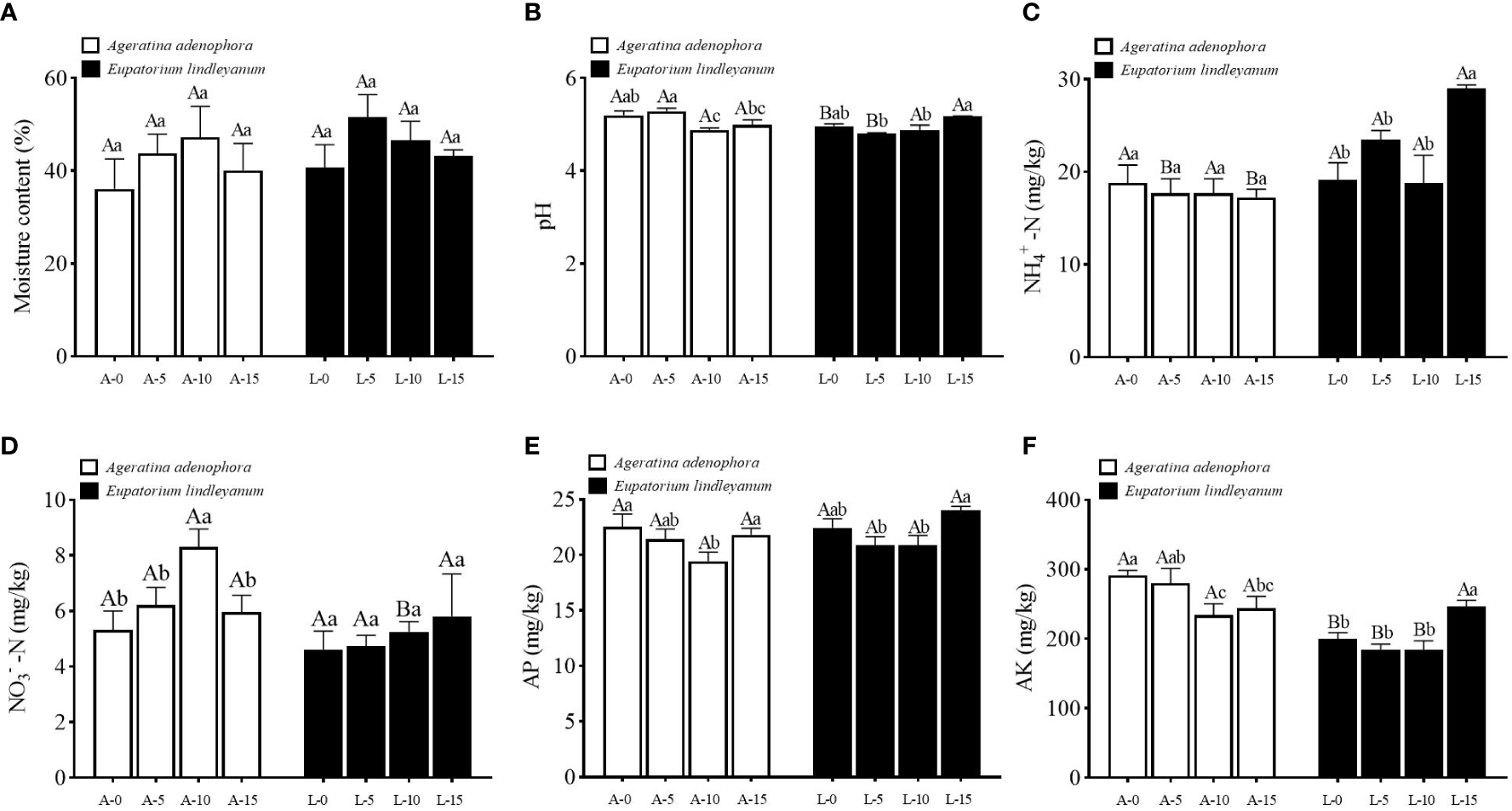 Physicochemical characteristic changes in rhizosphere soil for two kinds of plants treated with A.gossypii. (A) moisture content. (B) pH value. (C) NH4+-N, ammonium nitrogen. (D) NO3–N, nitrate nitrogen. (E) AP, available phosphorus. (F) AK, available potassium. A represents Ageratina adenophora, L represents Eupatorium lindleyanum, 0/5/10/15 represents the number of A.gossypii inoculated, different lowercase letters represent significant difference(LSD’s test, P<0.05) at the same plant, different uppercase letters indicate significant differences between treatments with same A. gossypii infestation (t-test, P<0.05). Error Bars are mean ± SE (n=5).