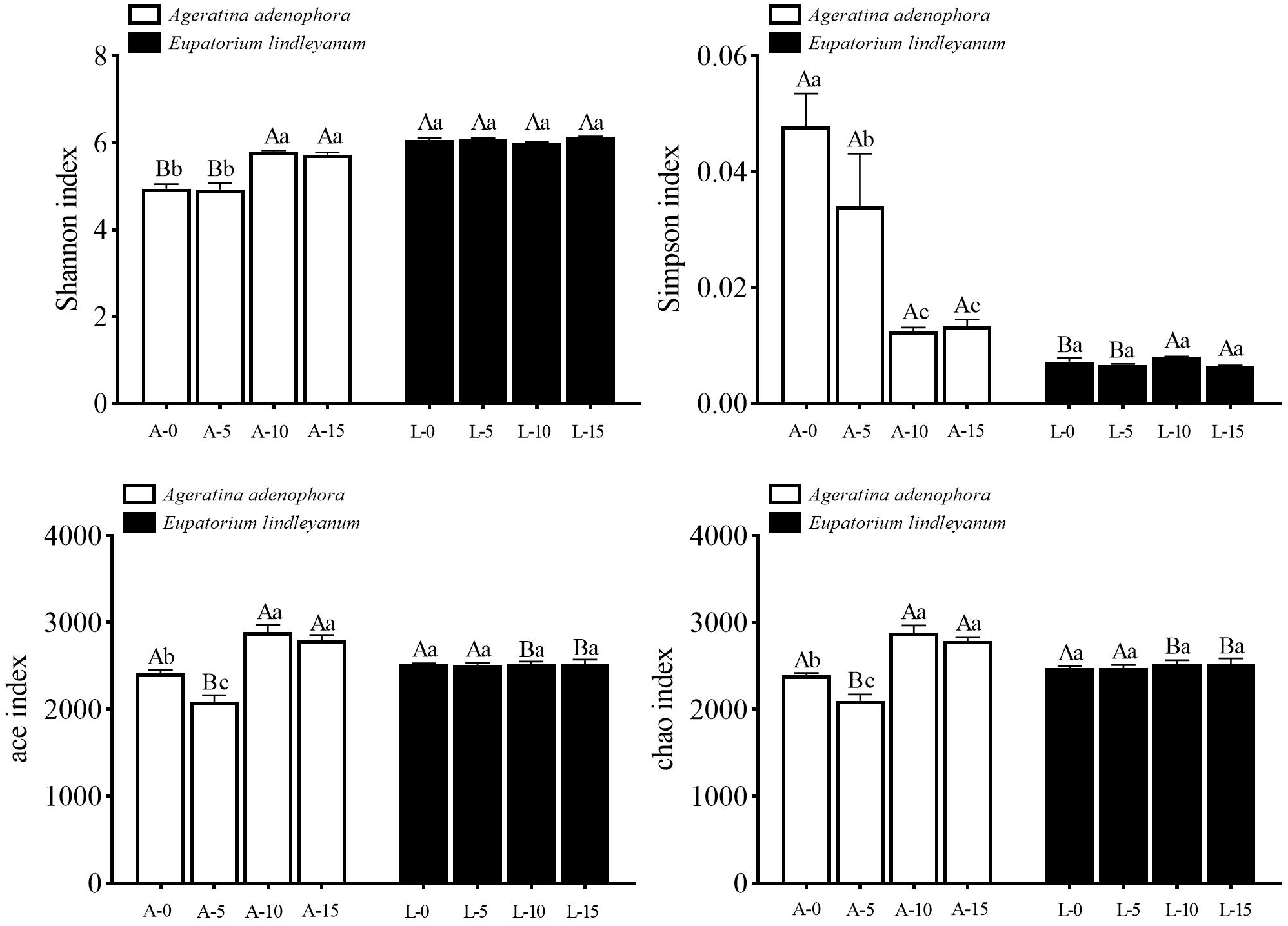 Changes of Alpha diversity indices for bacterial communities in rhizosphere soil for two kinds of plants treated with A.gossypii. A represents Ageratina adenophora, L represents Eupatorium lindleyanum, 0/5/10/15 represents the number of A.gossypii inoculated, different lowercase letters represent significant difference(LSD’s test, P<0.05) at the same plant, different uppercase letters indicate significant differences between treatments with same A. gossypii infestation (t-test, P<0.05). Error Bars are mean ± SE (n=5).
