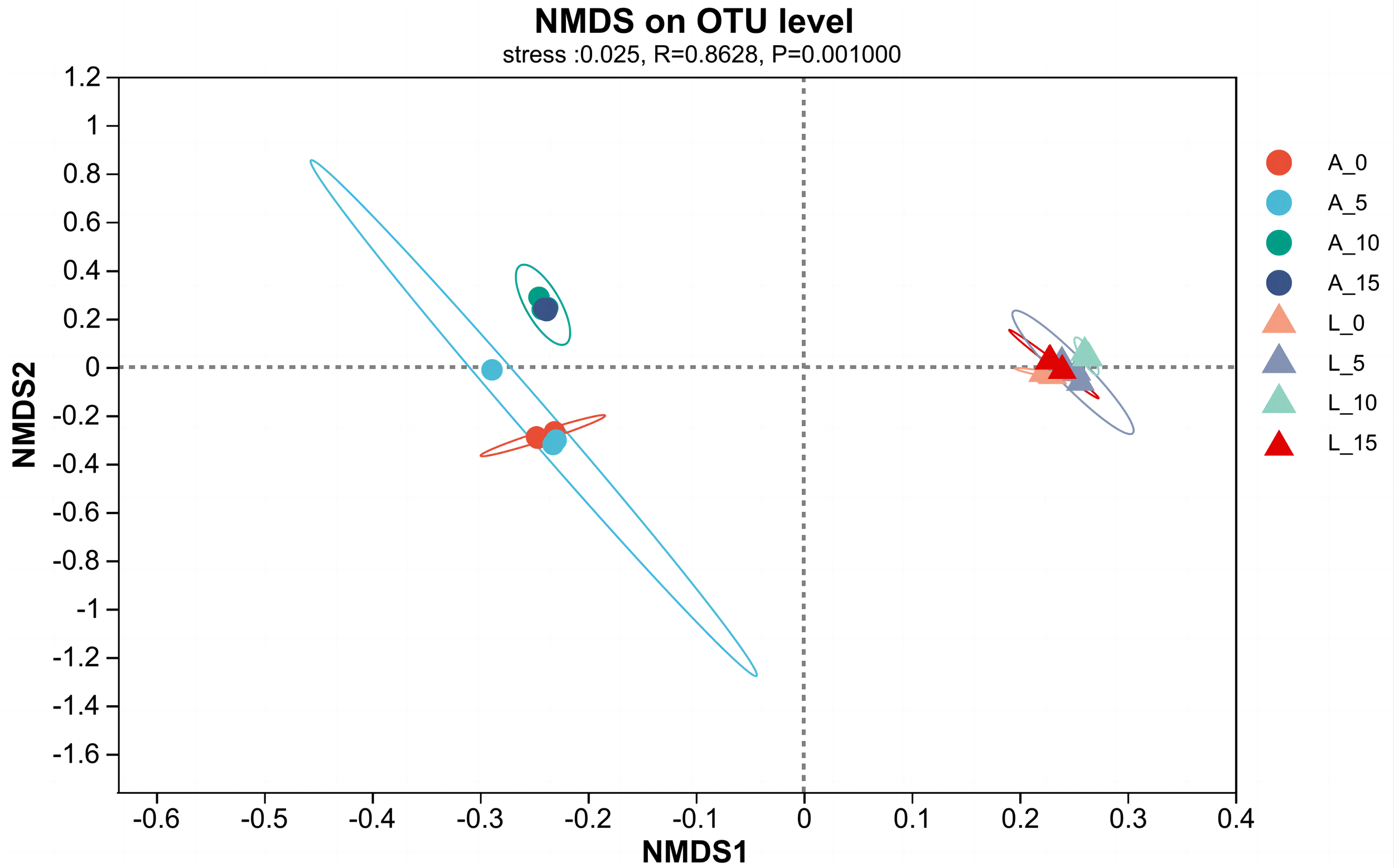 Non-metric multidimensional scaling of β diversity in soil bacterial communities after A.gossypii feeding. A represents Ageratina adenophora, L represents Eupatorium lindleyanum, 0 represents no A.gossypii, 5 represents 5 nymphs, 10 represents 10 nymphs, and 15 represents 15 nymphs.