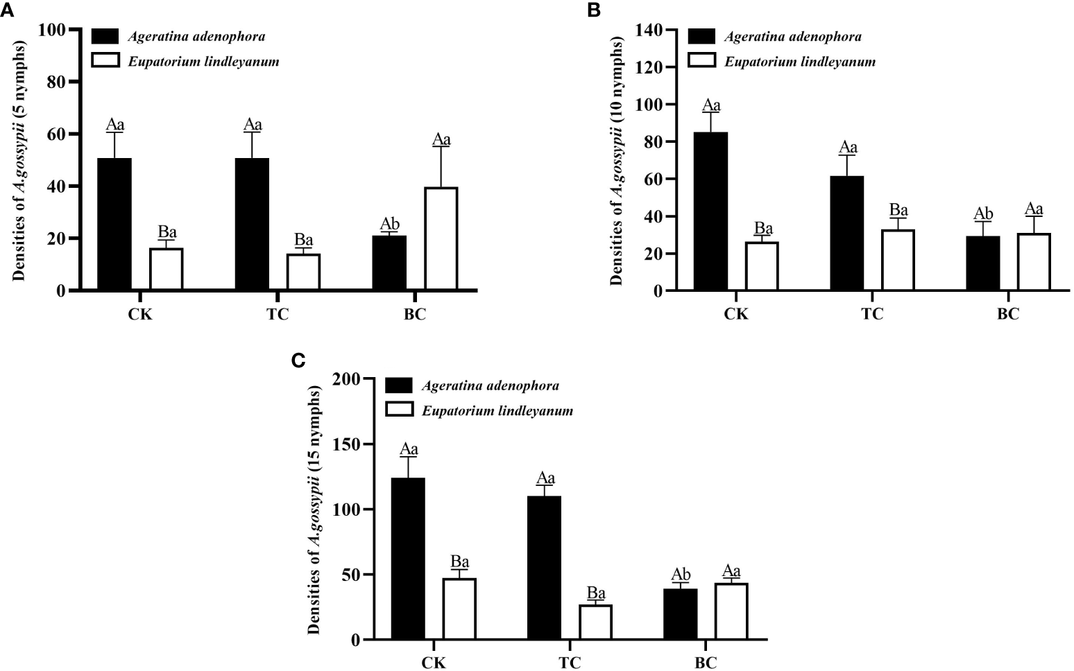 The population growth of A. gossypii on A. adenophora and E. lindleyanum after adding or excluding B. cereus. CK, addition with sterile water; TC, addition with thiosen copper; BC, inoculation with B. cereus.(A) represents infestation with 5 nymphs; (B) represents infestation with 10 nymphs; (C) represents infestation with 15 nymphs. Different lowercase letters above the bars represent significant differences among the three addition treatments (LSD’s test, P<0.05) in the same plant; different uppercase letters indicate significant differences between the same treatments in the different plants (t-test, P<0.05). Error Bars are mean ± SE (n=5).