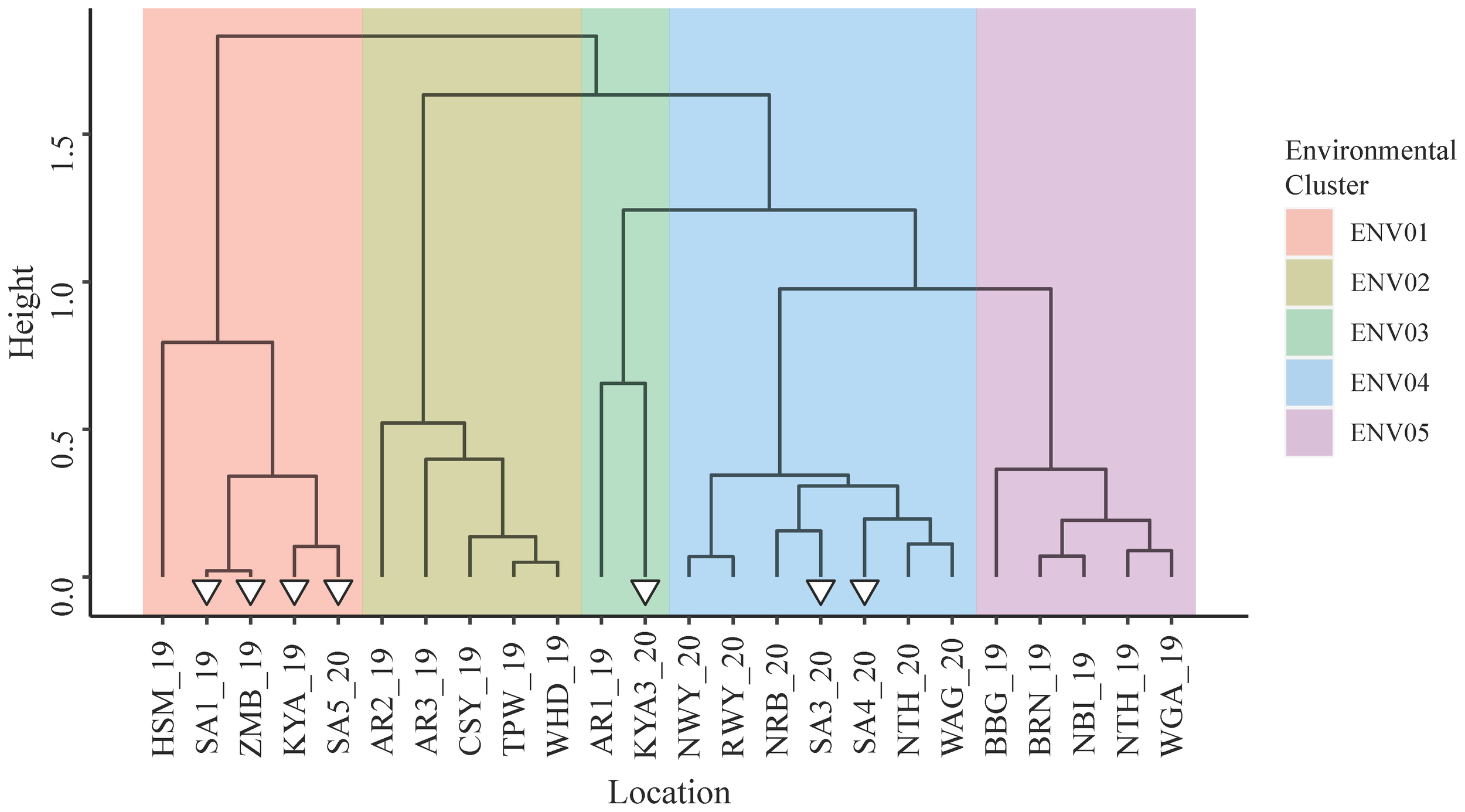 Environmental clusters revealed by hierarchical clustering of the additive genetic correlation matrix formed from the additive genetic variances and covariances between trial sites. White triangles identify trial sites within Sub-Saharan Africa.