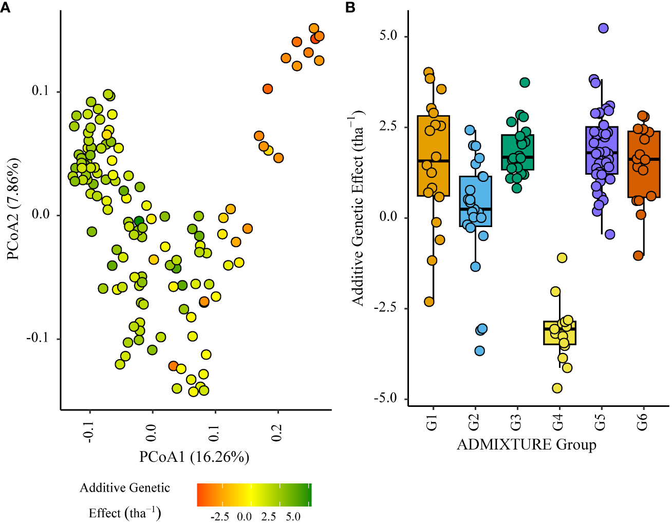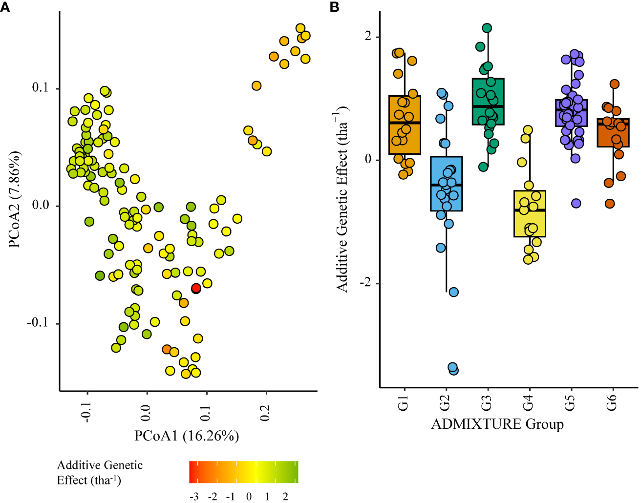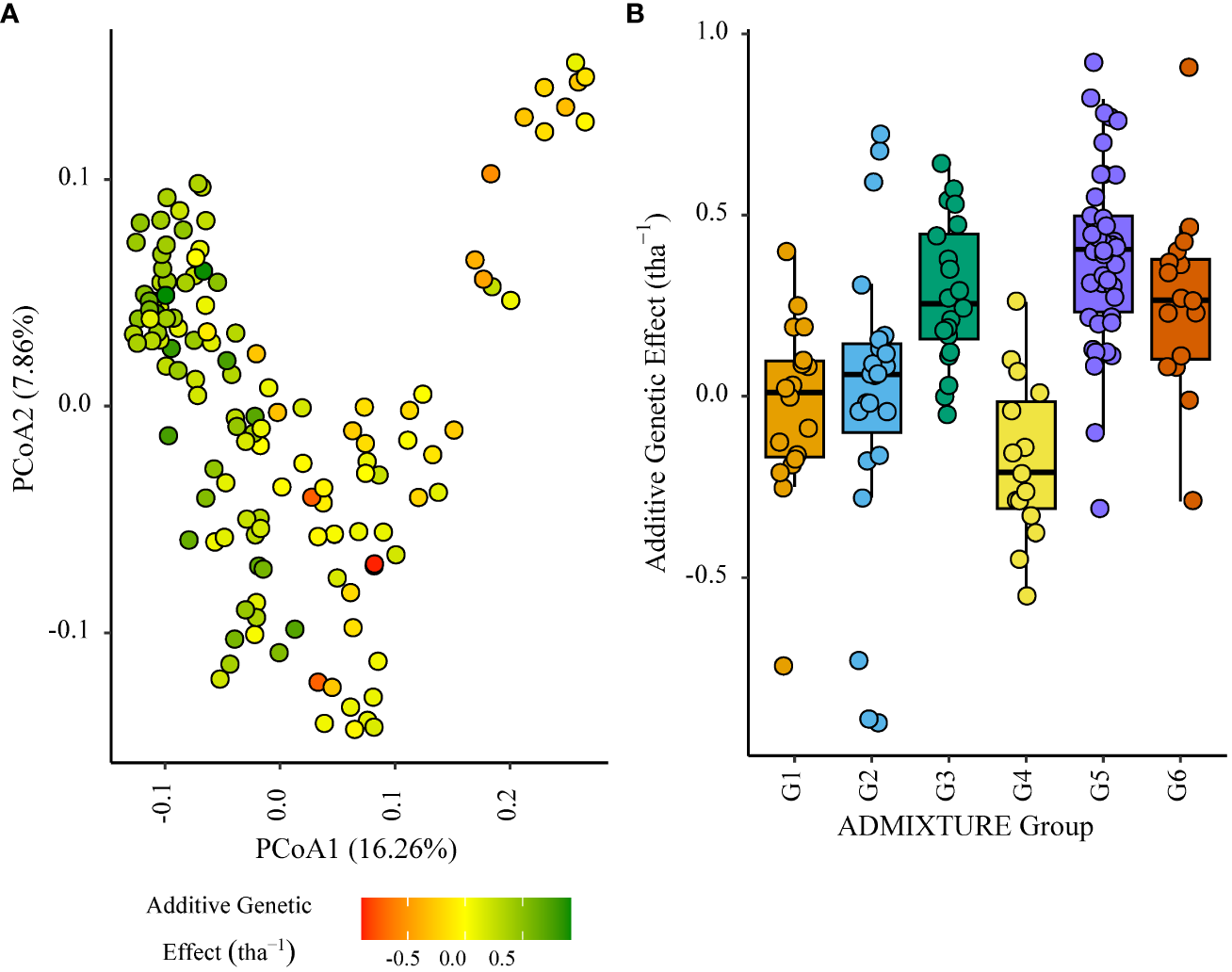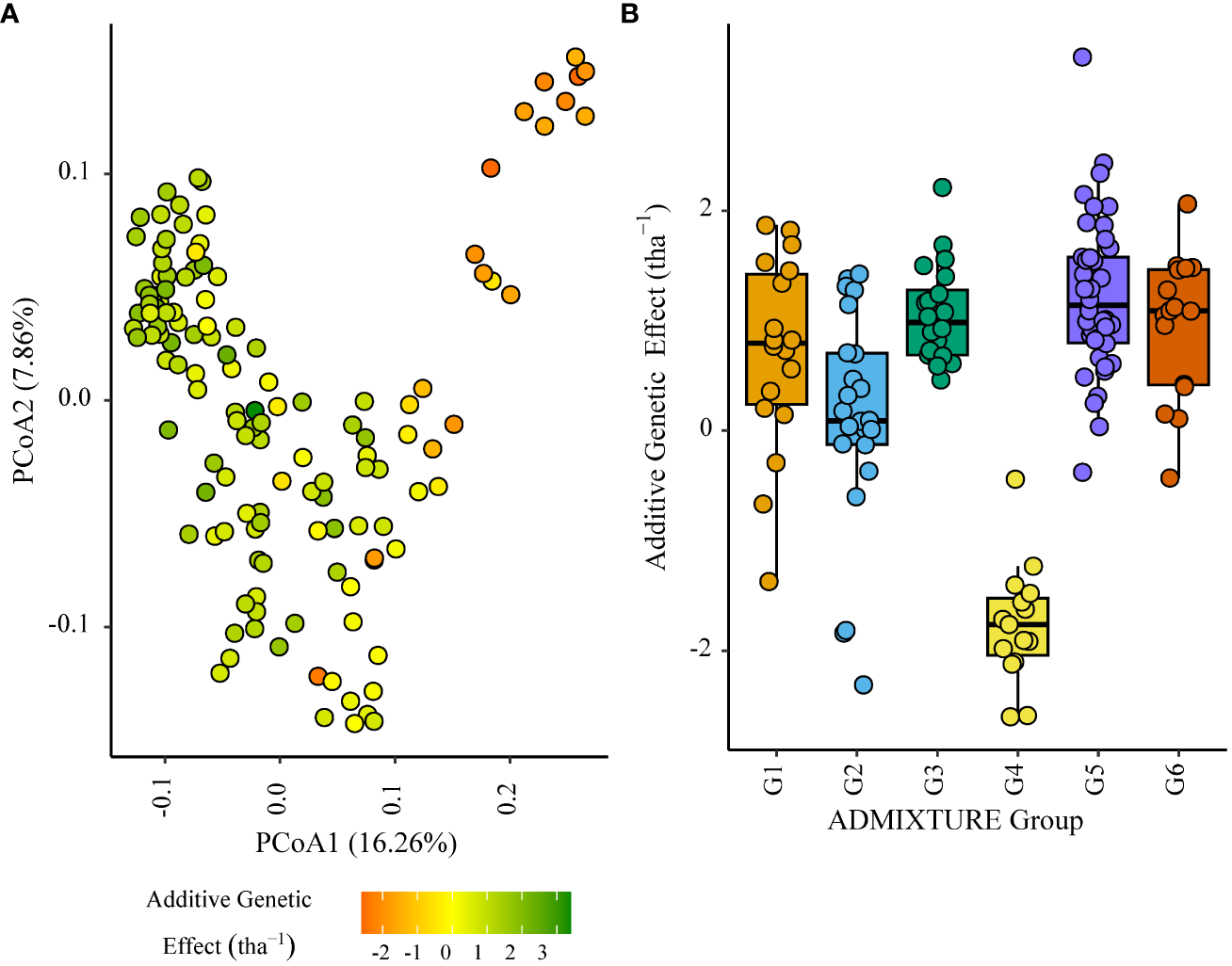Additive genetic effect (BLUP) for grain yield (tha-1) associated with parents in trial site SA5_20 (ENV01); (A) overlaid on plot of principal coordinate one (1) and two (2) derived from the Roger’s genetic distance between parents and (B) displayed as boxplots with genetic subgroup, from ADMIXTURE analysis, as the grouping factor.