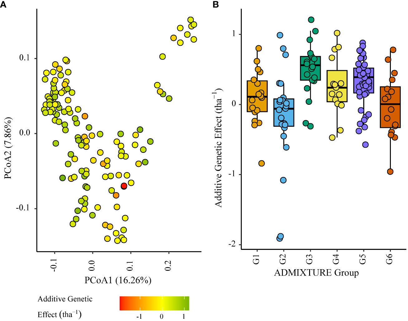 Additive genetic effect (BLUP) for grain yield (tha(tha-1) associated with parents in trial site KYA_19 (ENV01); (A) overlaid on plot of principal coordinate one (1) and two (2) derived from the Roger’s genetic distance between parents and (B) displayed as boxplots with genetic subgroup, from ADMIXTURE analysis, as the grouping factor.