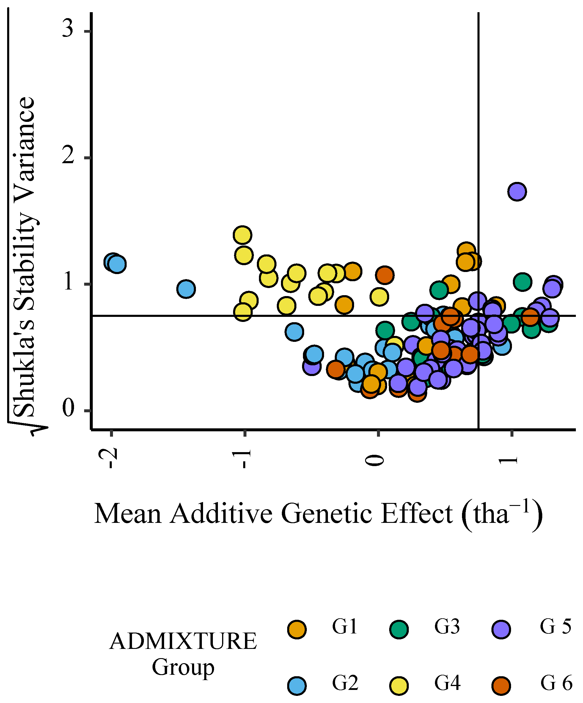 The stability of parental effects across trial sites in ENV01 and ENV04 was explored by plotting the mean additive effect of each parent against the square root of Shukla’s stability variance. Dividing the plot into quadrants identified parents with a stable positive contribution to grain yield (upper right quadrant); these individuals belonged to genetic subgroups G1, G3, G5 and G6 (Figure 10).