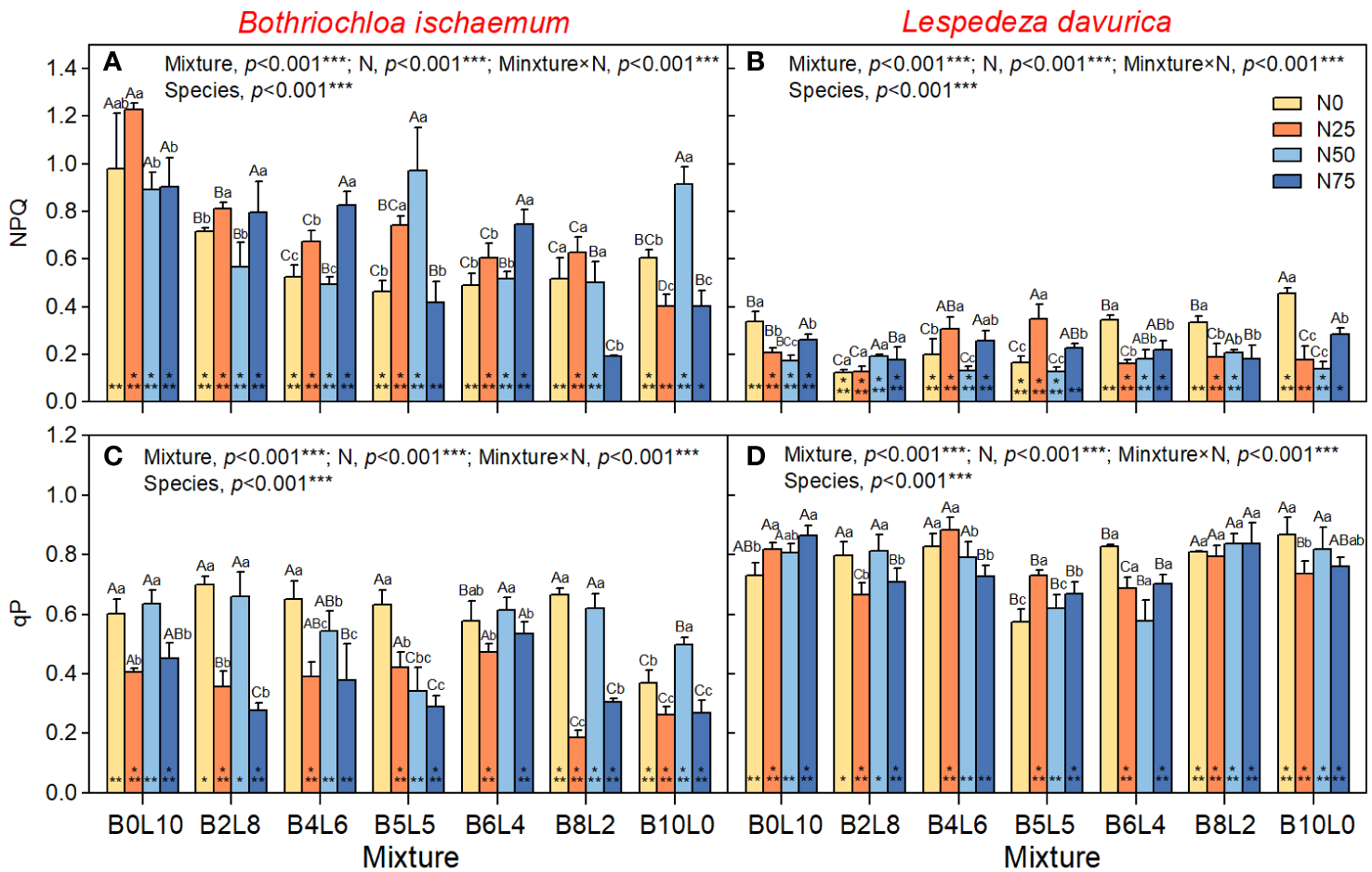Response of non-photochem-ical fluorescence quenching (NPQ), coefficient of photochemical fluorescence quenching (qP) of B.ischaemum and L.davurica to mixture ratios and nitrogen additions. (A) NPQ of B.ischaemum; (B) NPQ of L.davurica; (C) qP of B.ischaemum; (D) qP of L.davurica. The asterisk * indicate significant differences between B.ischaemum and L.davurica in same treatment at p< 0.05. Different capital letters indicate significant differences among the mixture ratio in the same N addition levels at p< 0.05;Different lowercase letters indicate significant differences among the N addition levels in the same mixture ratio at p< 0.05.