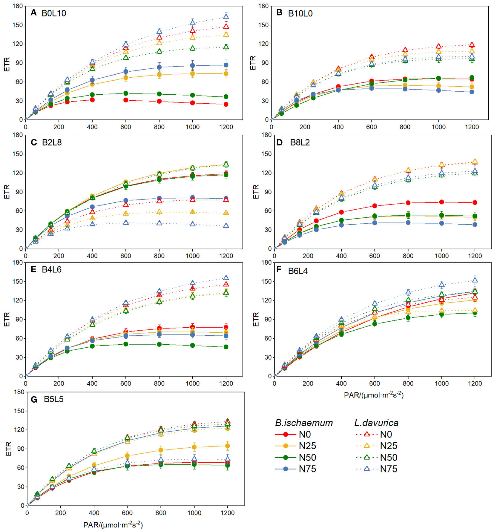 The rapid light-response curves of chlorophyll fluorescence of B.ischaemum and L.davurica in different mixture ratios and nitrogen levels. (A) B0L10; (B) B10L0; (C) B2L8; (D) B8L2; (E) B4L6; (F) B6L4; (G) B5L5.