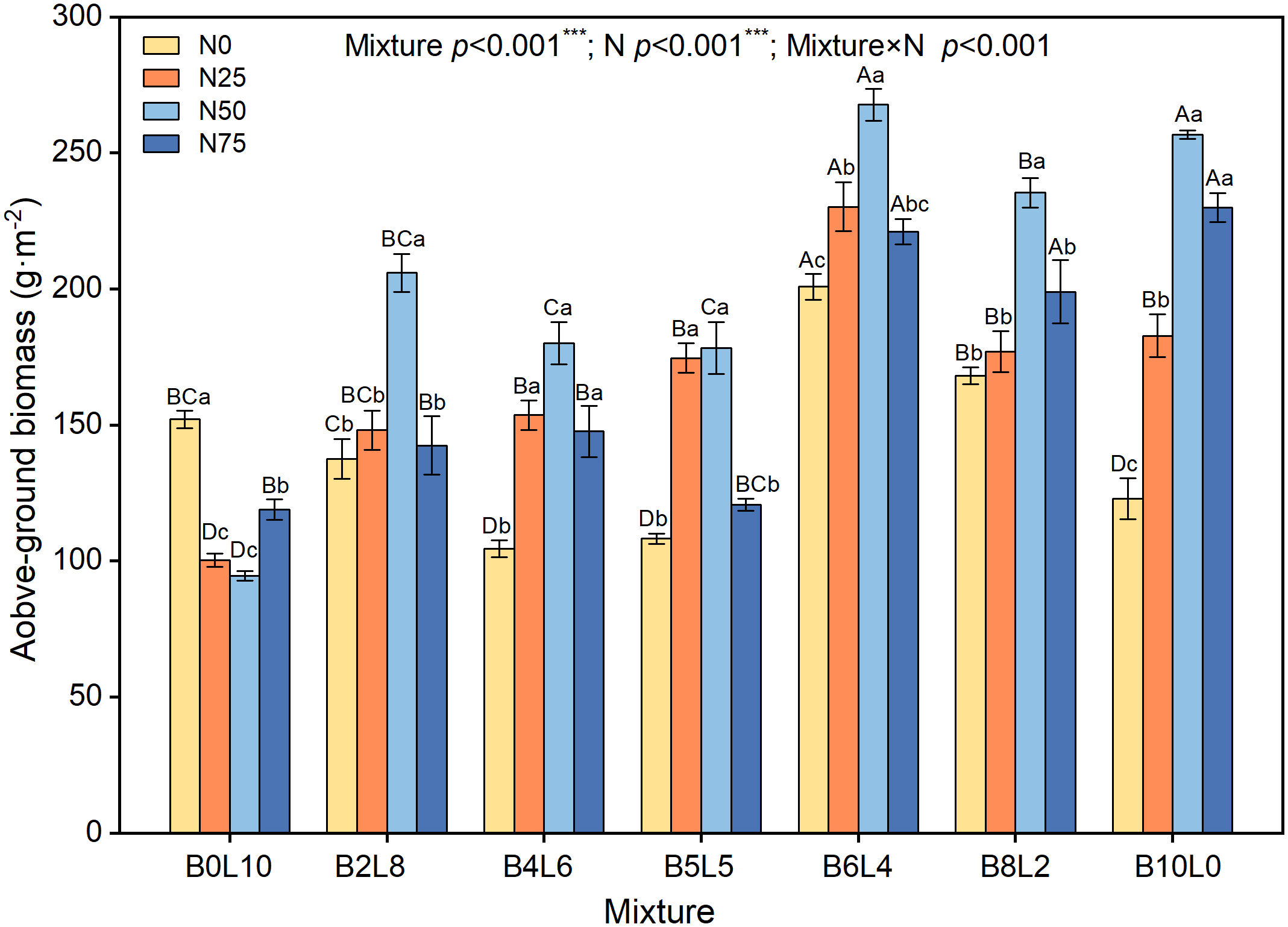 Response of community aboveground biomass to mixture ratios and nitrogen additions. Different capital letters indicate significant differences among the mixture ratio in the same N addition levels at p< 0.05; Different lowercase letters indicate significant differences among the N addition levels in the same mixture ratio at p< 0.05. ***means P ≤ 0.001, ** means P ≤ 0.01, *means P ≤ 0.05.