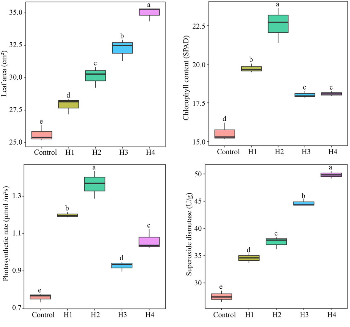 Effects of characteristic hormone spraying treatments on the growth and physiological indexes of tea tree seedlings. Control, tea seedlings not sprayed with hormone; H1, tea seedlings sprayed with 17.35 g/L l-tryptophan; H2, tea tree seedlings sprayed with 3.50 g/L indole; H3, tea tree seedlings sprayed with 3.25 g/L salicylic acid; H4, tea tree seedlings sprayed with 8.45 g/L salicylic acid 2-O-β-glucoside. Different lowercase letters indicate differences between samples at the p < 0.05 level.