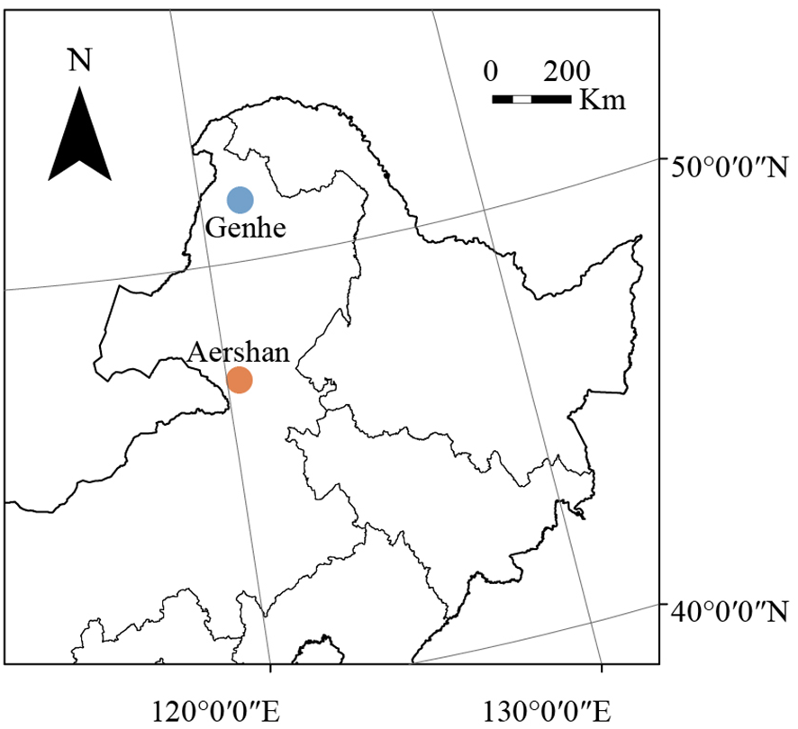The present study was conducted in two typical areas of L. gmelinii forests in the Greater Khingan Mountains, China (Figure 1, Table 1). One study area was located in the Aershan National Forest Park, Aershan (47°15′17″N, 120°17′34″E, shortened to Aershan), the southernmost area of L. gmelinii growing in China. The other was located in the Jinlin Forest Farm, Genhe (51°21′51″N, 121°20′31″E, shortened to Genhe), which is the core area for the distribution of L. gmelinii. The study area is located in a high-latitude permafrost distribution area in China (Ding et al., 2019). The winters in the study areas were long and cold, the summers were short and rainy, and spring and autumn were cool with less precipitation (Liu et al., 2020). The dominant tree species in these areas were L. gmelinii and Betula platyphylla, with a forest coverage rate of 80%. The zonal soil at both sites is Retisol (IUSS Working Group, 2015). The soil in Aershan is a typical black soil that is soft, moist, and nutritious, whereas the soil in Genhe is rich in gravel. A shovel was used to turn over the stones and obtain the soil in the stone cracks.