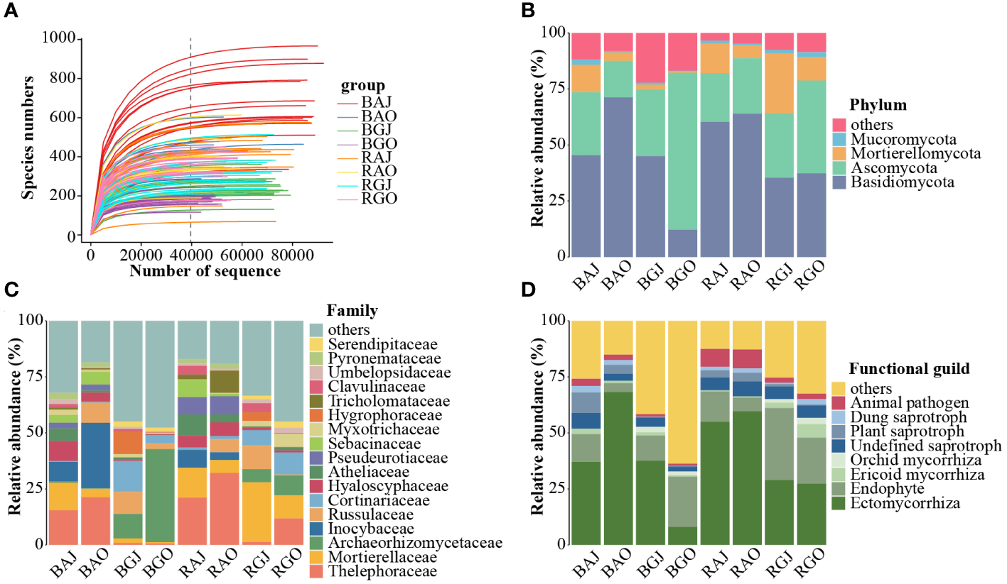 Fungal community structure in different compartments, seasons, and sites. (A) The rarefaction curve of the total 120 samples. Fungal community composition at phylum (B) and family (C) levels, and the functional guilds (D) of the community. In Figure (D), red represents pathotroph, a series of blue represents saprotroph, a series of green represents symbiotroph. A, Aershan; G, Genhe; J, July; O: October; B, Bulk; R, Rhizosphere. BAJ, bulk soil in Aershan, July; BAO, bulk soil in Aershan, October; BGJ, bulk soil in Genhe, July; BGO, bulk soil in Genhe, October; RAJ, rhizosphere soil in Aershan, July; RAO, rhizosphere soil in Aershan, October; RGJ, rhizosphere soil in Genhe, July; RGO, rhizosphere soil in Genhe, October.