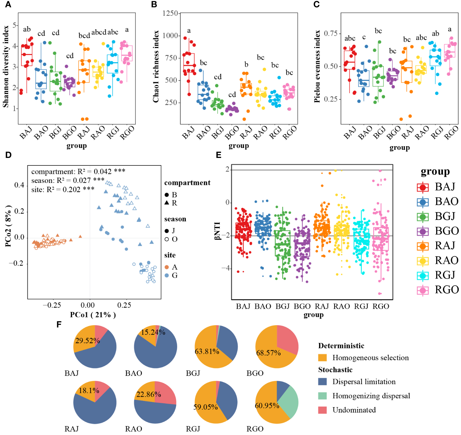 3.3 Fungal diversity and community assembly processes among different compartments, seasons, and sites