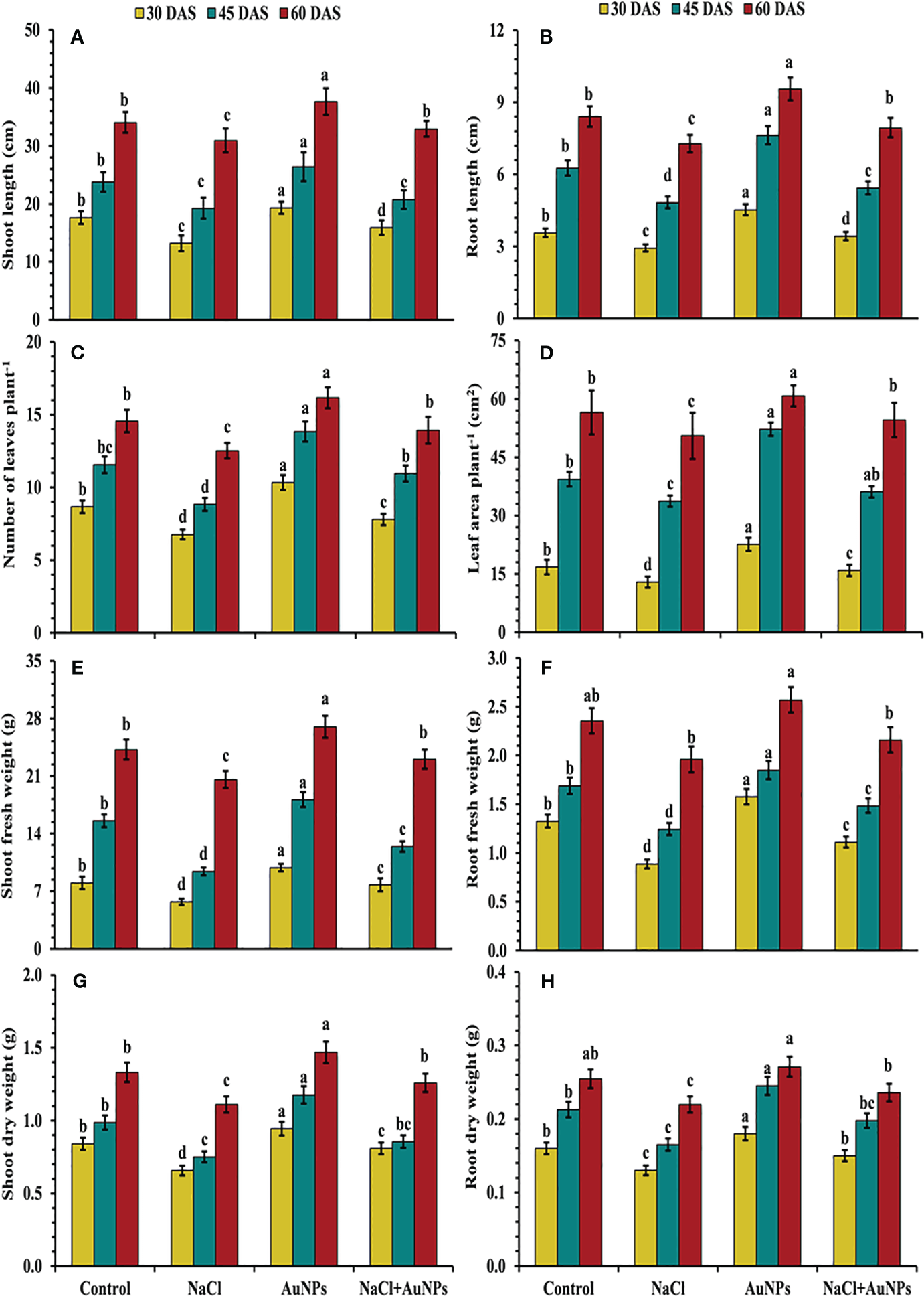 Figure 2 (A) Shoot length, (B) root length, (C) number of leaves per plant, (D) leaf area, (E) shoot fresh weight, (F) root fresh weight, (G) shoot dry weight, and (H) root dry weight in S. oleracea plant grown individually with control, 50 mM NaCl, 150 µM S-AuNPs and 50 mM NaCl + 150 µM S-AuNPs at 30, 45, and 60 DAS. Each bar represents mean ± SE of three replicates. Means followed by the same letter (s) do not differ by DMRT test at 5% probability level (p ≤ 0.05).