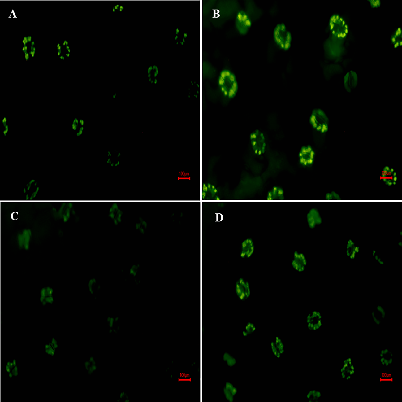 Figure 6 Fluorescence microscopy response of in-situ localization of H2O2; at 30 days old S. oleracea leaves treated with (A) control, (B) 50 mM NaCl, (C) 150 µM S-AuNPs, and (D) 50 mM NaCl + 150 µM S-AuNPs at 40X.