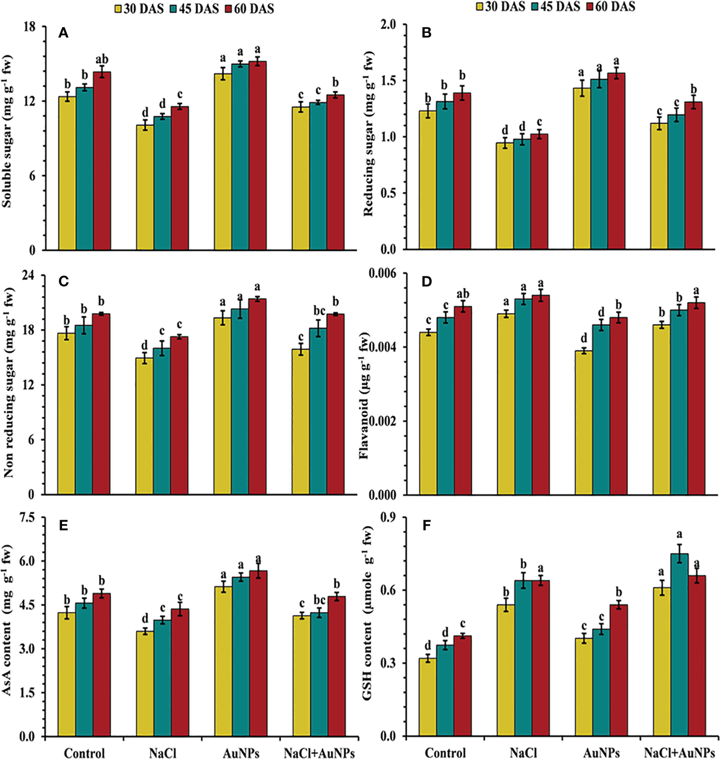 Figure 7 (A) Total soluble sugar, (B) reducing sugar, (C) non reducing sugar, (D) flavonoid content, (E) ascorbate, and (F) glutathione content in S. oleracea plant grown individually with control, 50 mM NaCl, 150 µM S-AuNPs and 50 mM NaCl + 150 µM S-AuNPs at 30, 45, and 60 DAS. Each bar represents mean ± SE of three replicates. Means followed by the same letter (s) do not differ by DMRT test at 5% probability level (p ≤ 0.05).
