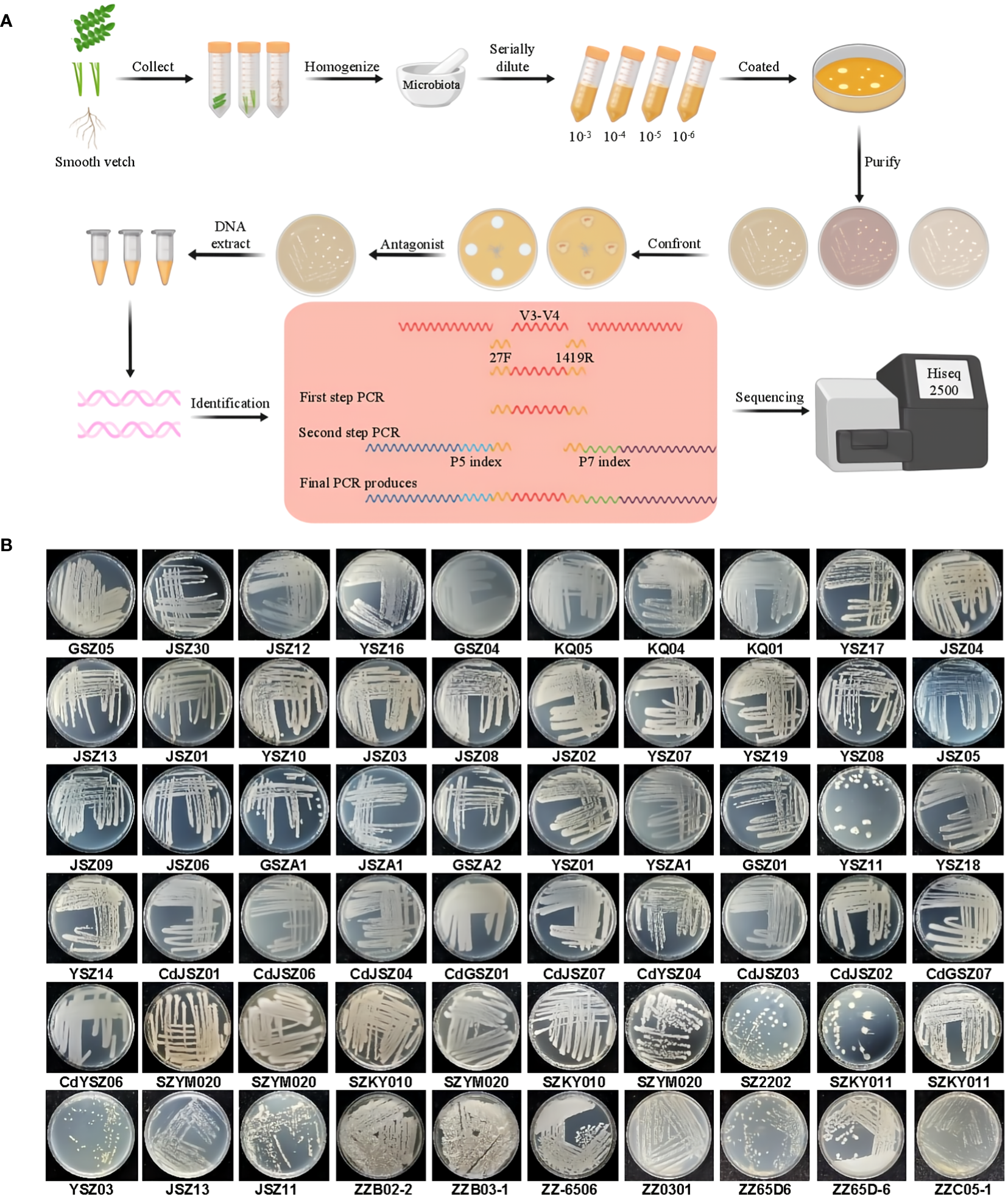 Growth characteristics of 60 endophytic bacteria isolated from smooth vetch. (A) Smooth vetch can be cultivated for the isolation and identification of endophytic bacteria for detailed analysis of experimental procedures. (B) Growth characteristics of 60 strains of endophytic bacteria.
