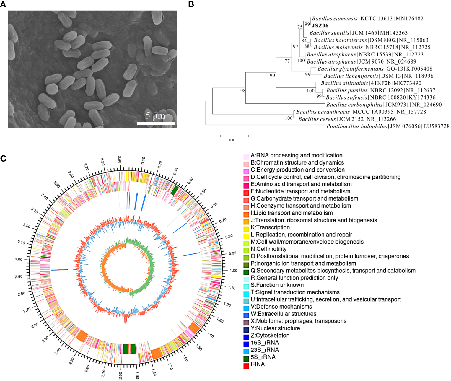 Characterization of strain JSZ06. (A) Scanning electron micrograph of JSZ06. (B) Phylogenetic tree of 16S rRNA gene of JSZ06. (C) JSZ06 strain genome ring diagram. Genome size identification is represented by the outermost circle of the ring diagram; CDS on the positive and negative strands are represented by the second and third circles; rRNA and tRNA are represented by the fourth circle; GC content is represented by the fifth circle; and the GC-Skew value is represented by the innermost circle.