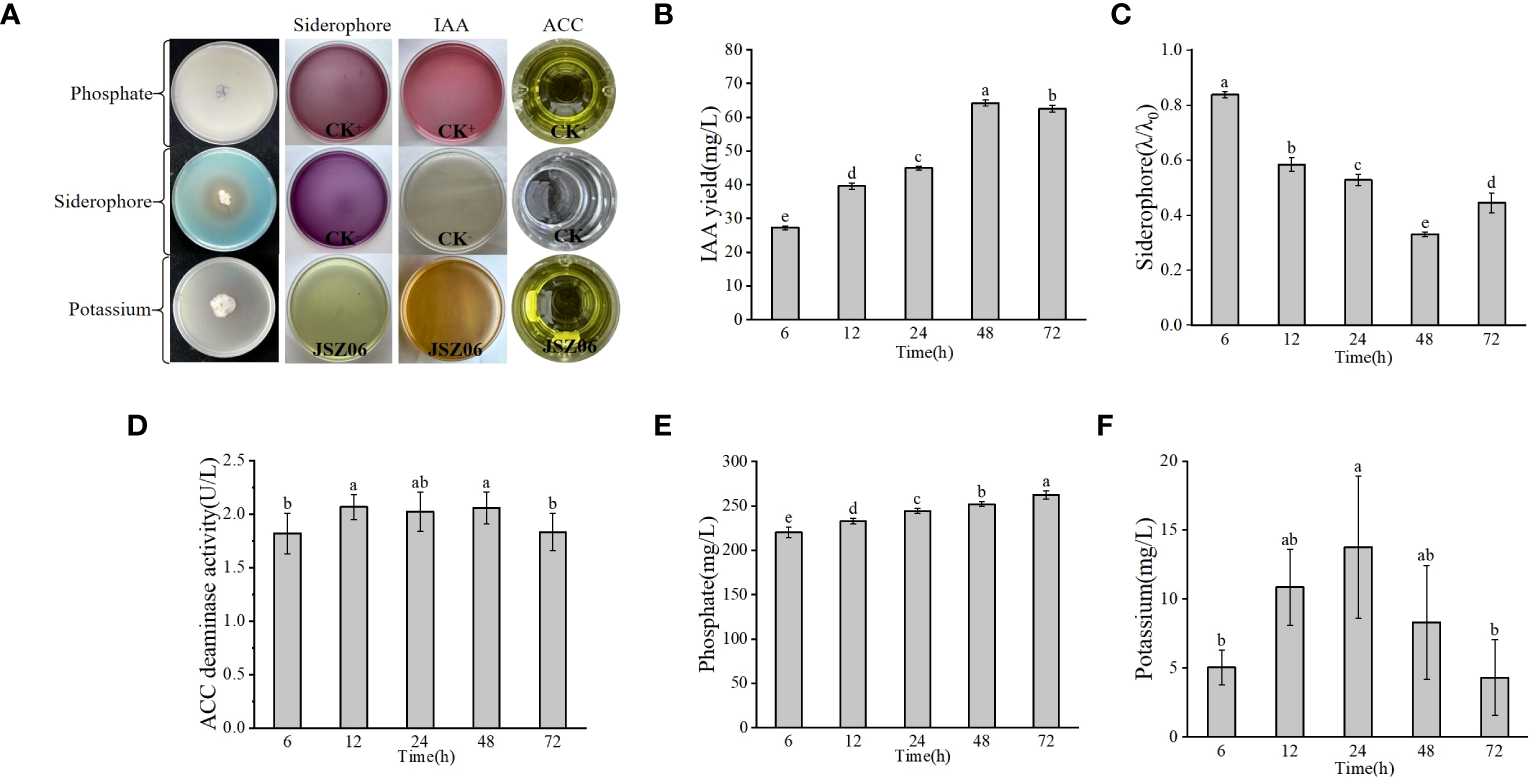 Evaluation of PGP traits and genetic detection of antimicrobial active substances in plant endophytes. (A) PGP traits of JSZ06. (B–F) Determination of IAA, iron carrier, ACC, phosphate solubilisation and mineral potassium solubilisation yields during culture of endophyte JSZ06. The error bars represent the standard deviations of the means from three independent experiments. Different lowercase letters indicate a significant difference at the level of P< 0.05. Production of siderophores (λ/λ0) ranges from small (0.8-1.0), low (0.6-0.8), moderate (0.4-0.6), high (0.2-0.4), to extremely high (0-0.2).