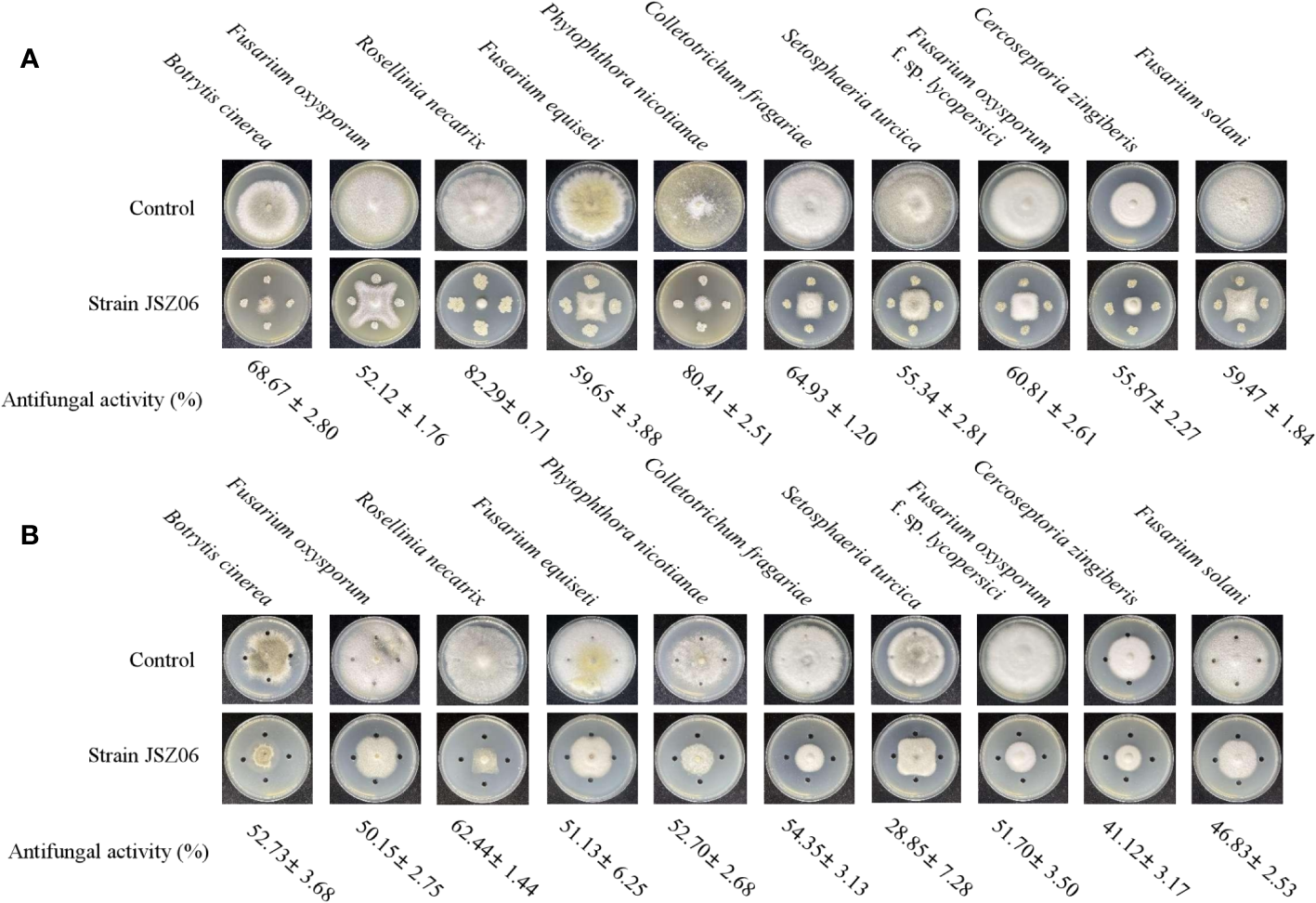 Wide-ranging antifungal action of JSZ06, an antagonistic fungus. (A) The ability of strain JSZ06 to inhibit a certain plant-pathogenic fungus. (B) Crude extract’s antifungal efficacy against a specific plant-pathogenic fungus.