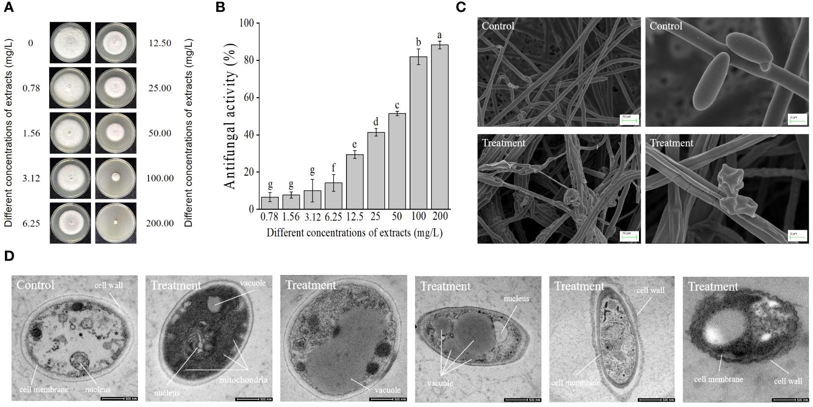 Impact of strain JSZ06 extracts on Foc TR4 mycelial development and ultramorphology. (A)Foc TR4 growth inhibition on PDA medium after different extraction dosages were applied. (B) Growth inhibition rate of Foc TR4 after treatment with different extraction doses. (C) SEM observation of the mycelial morphology of Foc TR4. (D) TEM micrographs showing 50 mg/L of strain JSZ06 treated Foc TR4 cells. The Foc TR4 mycelium treated with 10% DMSO is characterized by blanks. Foc TR4 treated with 50 mg/L of strain JSZ06 extract and its mycelial morphology. At the significance threshold of P< 0.05, different lowercase letters indicate a significant difference.