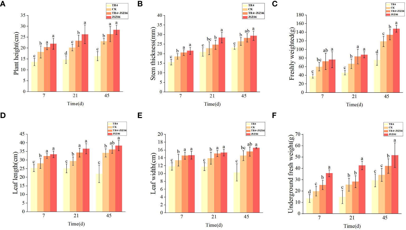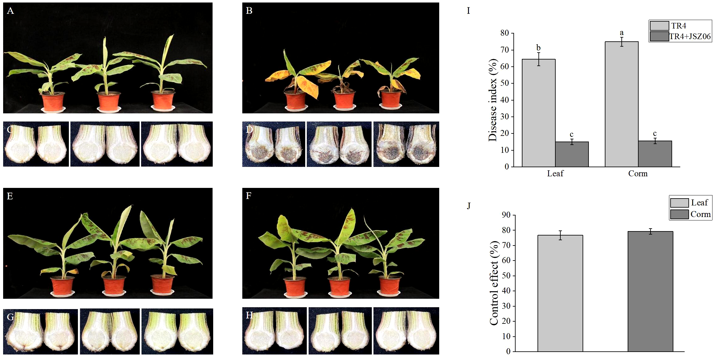 Forty-five days after inoculation, the infection of banana leaves and bulbs was observed and recorded separately. The disease index and control effect of each group were computed following the methods of Fan et al. (2021) and Zhou et al. (2023). The following standards for assessing leaf diseases were applied: grade 0: no indications; grade 1: no more than 50% of the whole area with wilting of true leaves and cotyledons; grade 2: more than 50% of the whole area with wilting of true leaves and cotyledons; grade 3: just the growth tips remained, with the leaves withered or dead; grade 4: the whole plant seemed very withered or dead. Bulb disease grading: grade 0: no lesions on the bulb; grade 1: the area of lesions on the bulb is 1% - 10%; grade 2: the bulb lesion area is 11%~30%; grade 3: the bulb lesion area is 31%~50%; grade 4: the bulb lesion area is more than 50%. Plant height, fresh weight, stem thickness, leaf length and leaf width of the banana plants in all treatments were measured and recorded on days 7, 21 and 45 after inoculation.