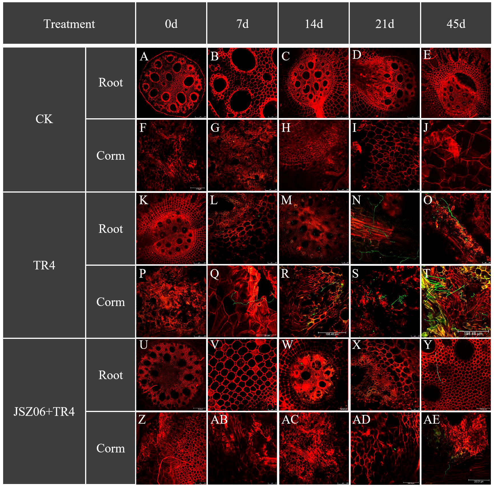 On days 0, 7, 14, 21 and 45 of inoculation, banana roots and bulbs were collected and cut as finely as possible. A confocal laser scanning microscopy (Leica TCS-SP, Wetzlar, Germany) was used to rapidly detect the level of GFP-Foc TR4 infection and settlement (Zhou et al., 2023).