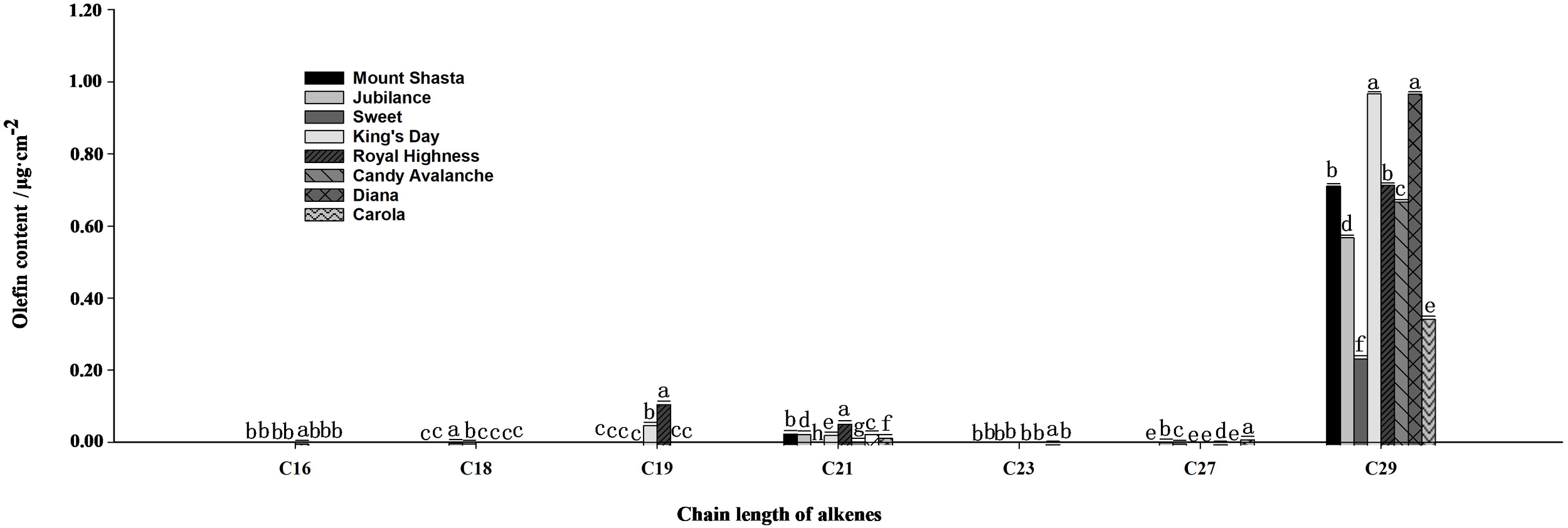 Analysis of olefin contents in full blooming rose petals. Data are the mean ± SD of three independent replicates (n = 3). Lowercase letters indicate significantly differences between the eight rose cultivars at P < 0.05.