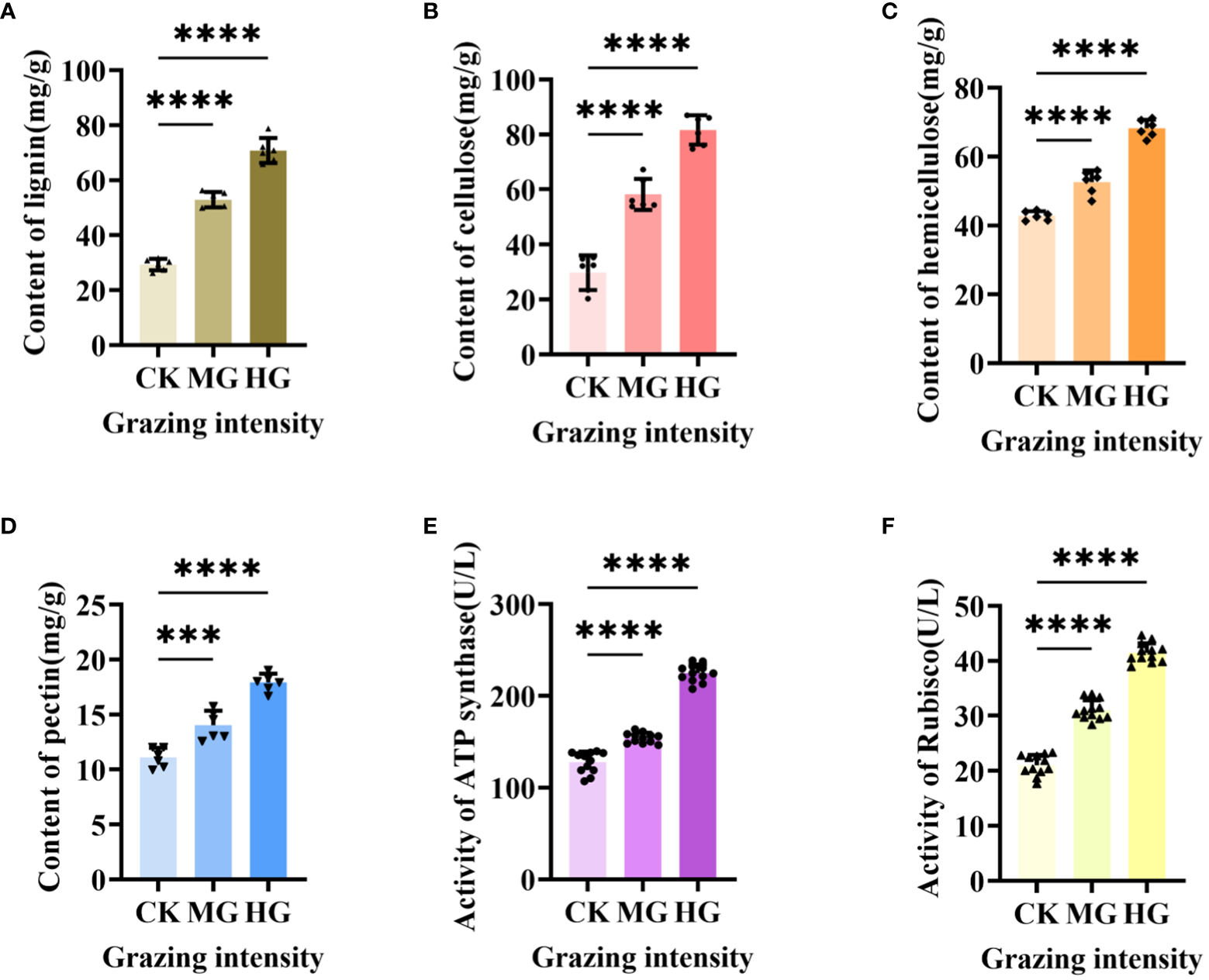 Cell wall composition and activity of two enzymes under different grazing intensities. (A) Content of lignin. (B) Content of cellulose. (C) Content of hemicellulose. (D) Content of pectin. (E) Activity of ATP synthase. (F) Activity of Rubisco-activating enzyme. *** indicates P<0.001, **** indicates P<0.0001.