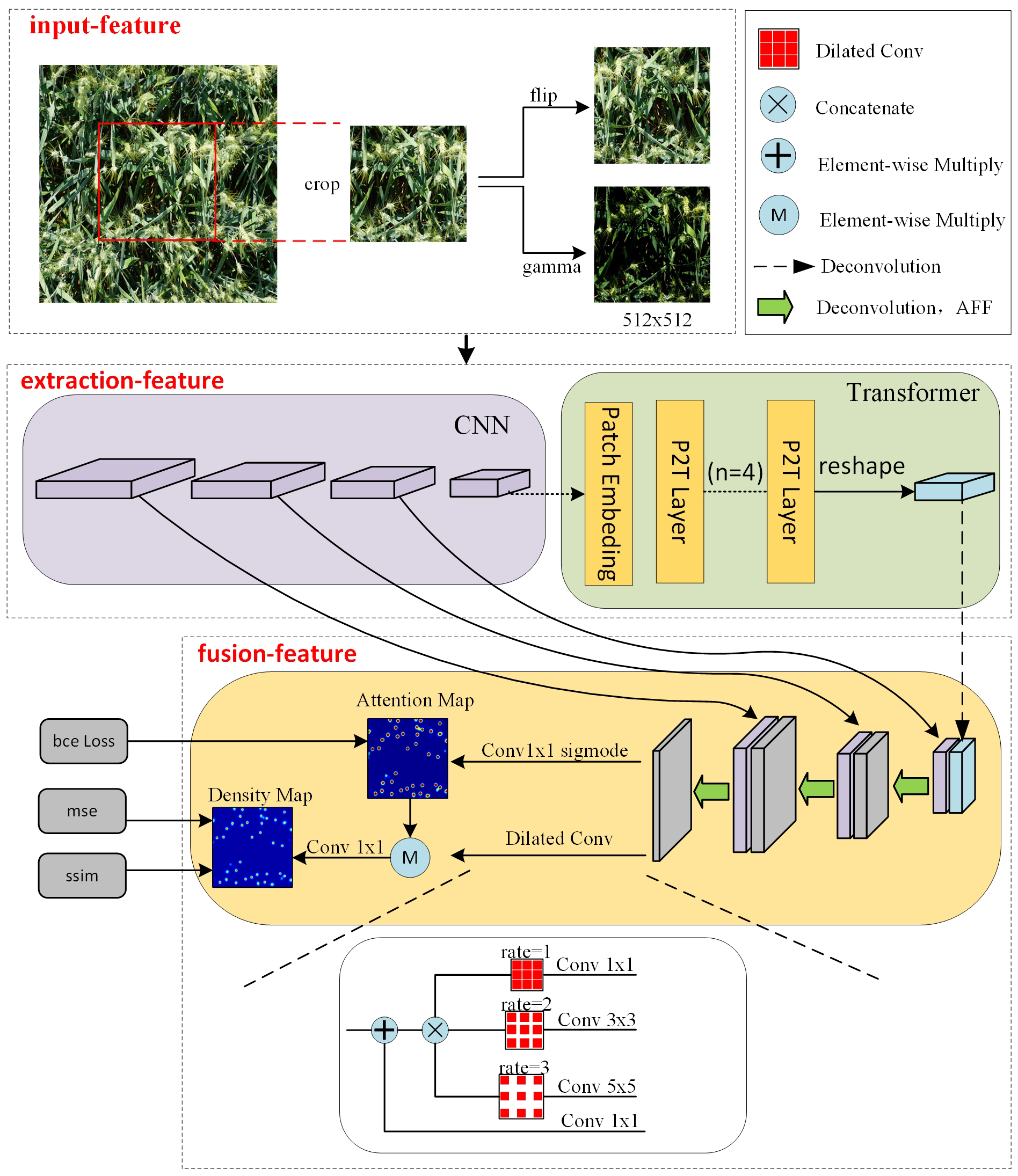 As shown in Figure 2, we constructed a network structure in which the input images for the training process are obtained by randomly clipping the original images. Taking the input image size of 512 × 512 pixels as an example. Firstly, local features are extracted through convolution network, using four convolutional kernels with of 2 and channel dimensions of 64, 256, 512and 512 to obtain multiscale feature maps with sizes of 256 × 256 pixels, 128 × 128 pixels, 64 × 64 pixels and 32 × 32 pixels respectively. The large-scale feature map is derived from the shallow network, which has high resolution and good detail feature representation ability. On the contrary, the small-scale feature map is extracted from the deep network and contains more semantic information, but the resolution is low and the representation ability of spatial details is weak. Patch embedding is applied to extract 1×1 patch from the minimum scale feature map extracted by CNN, capturing the global contextual information of the feature maps while keeping the resolution constant. This is helps to consider local details and global information in image processing and improves the understanding of image content. Then, multi-scale feature fusion is carried out through the attention mechanism to output the prediction density map. When generating the density map, the dilated convolution layers with different expansion rates are superimposed in parallel to make the predicted density map contain more spatial information and expand the perception domain. Taking the RGB image as input, three features are input, and the features are increased to 512 in the feature extraction stage, and then the features are reduced to two by the feature fusion, one for the loss calculation of the density map and one for the loss calculation of the attention map.