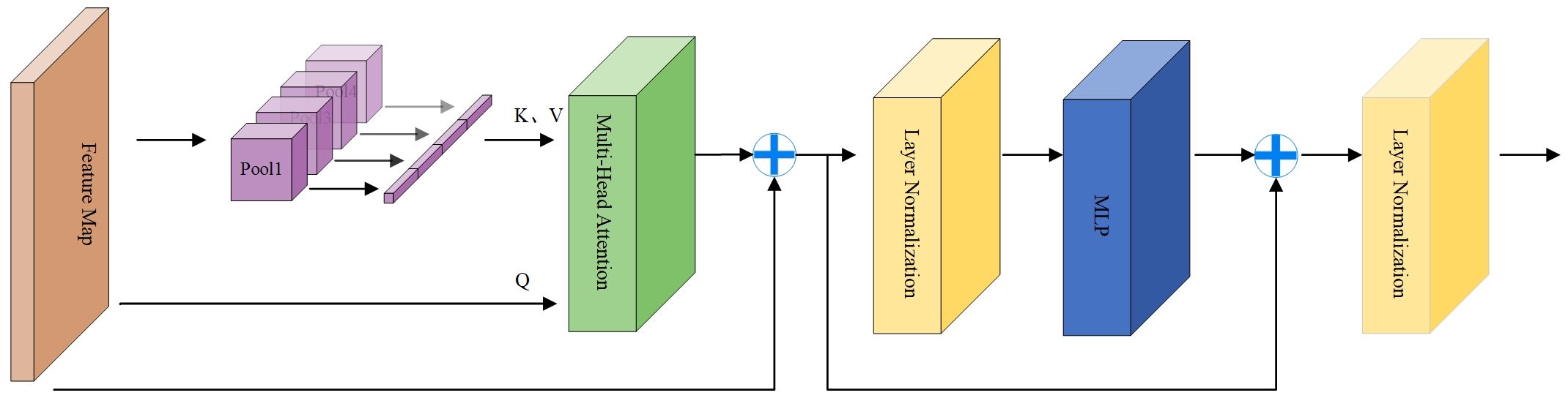 In addition, we also use the P2T structure to capture global context information. It introduces pyramid pooling in the multi-head self-attention module of vision Transformer. The benefits are reduced sequence length, reduced computation, and the ability to simultaneously learn strong contextual representations for better semantic features. The calculation process is shown in Figure 4. The input first passes through a pooling based multi head self-attention module, and its output adds residuals and performs normalization layer. Like traditional transformer blocks, a Feedforward Network (FFN) (Vaswani et al., 2017) is used for feature projection. Finally, apply residual connections and a normalization layer again.