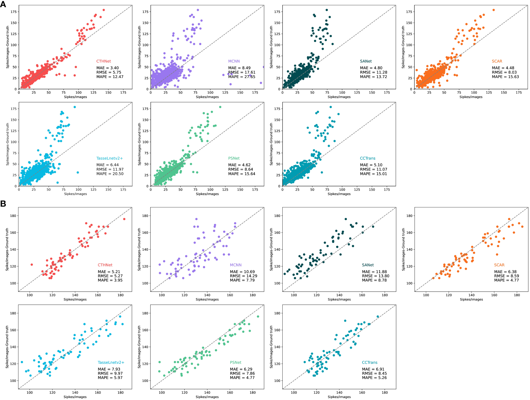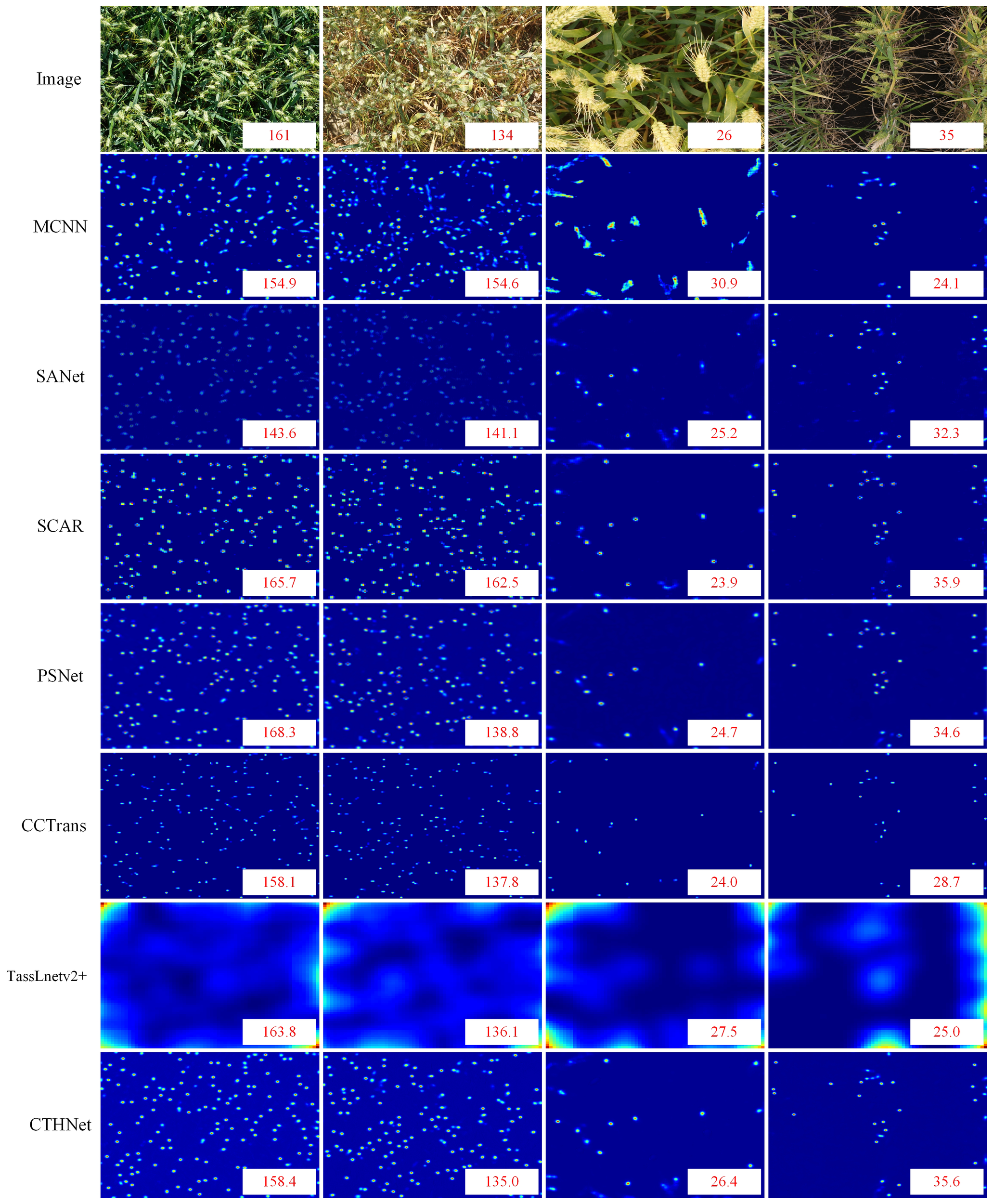 In recent years, density regression algorithms have progressed quickly and been used in a variety of counting applications. We contrast our method with various density counting methods, such as MCNN (Zhang et al., 2016), SANet (Cao et al., 2018), SCAR (Gao et al., 2019), PSNet (Cheng et al., 2020), TasseLnetv2+ (Lu and Cao, 2020) and CCTrans (Tian et al., 2021). We evaluated the counting performance of the proposed model on two public wheat ear detection datasets GWHD and WEDD (Table 3).