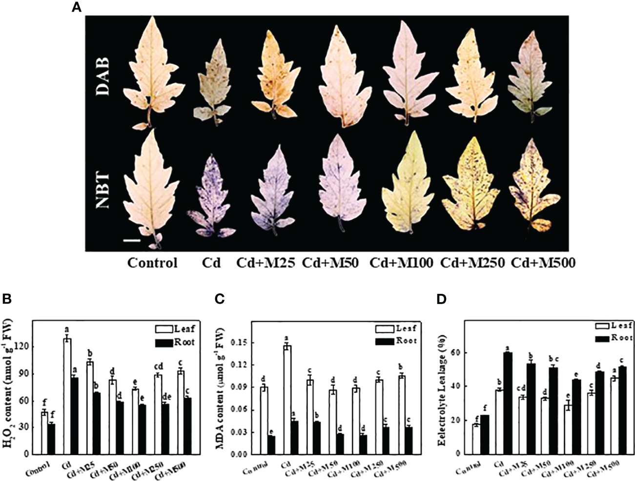 Effects of melatonin on ROS accumulation, lipid peroxidation, and membrane integrity after 14 days long Cd stress. (A) The in situ detection of H2O2 (upper panel) and O2·− (lower panel) in tomato leaves. Bar = 1.0 cm, (B) H2O2 concentrations in tomato leaves and roots, (C) MDA concentrations in tomato leaves and roots, and (D) Electrolyte leakage from tomato leaves and roots. Accumulation of H2O2 and O2·− in leaves was visually detected by staining with 3, 3-diaminobenzidine (DAB) and nitroblue tetrazolium (NBT), respectively. The data shown are the averages of four replicates, with the standard errors indicated by the vertical bars. The means denoted by the same letter within the same color histograms did not significantly differ at a P < 0.05, according to Tukey’s test. Cd, 100 μM cadmium; M25, 25 µM melatonin; M50, 50 µM melatonin; M100, 100 µM melatonin; M250, 250 µM melatonin; M500, 500 µM melatonin; FW, fresh weight.