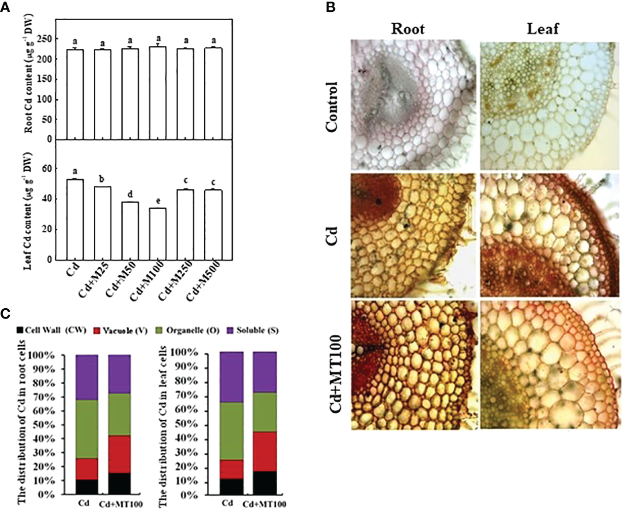 The accumulation of cadmium in tomato plants and its subcellular distribution following 14 days long Cd stress as influenced by melatonin treatments. (A) Cd concentrations in tomato roots and leaves. (B) The in situ detection of Cd in tomato roots and leaves using a dithizone staining-based histochemical method (C) The distribution of Cd in different subcellular compartments. The data shown in (A), are the averages of four replicates, with the standard errors indicated by the vertical bars. The means denoted by the same letter did not significantly differ at a P < 0.05, according to Tukey’s test. Cd, 100 μM cadmium; M25, 25 µM melatonin; M50, 50 µM melatonin; M100, 100 µM melatonin; M250, 250 µM melatonin; M500, 500 µM melatonin; DW, dry weight.