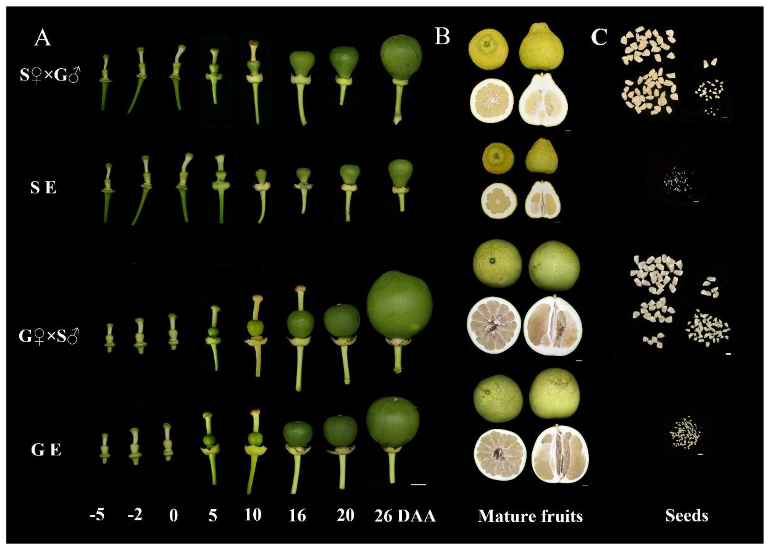 Morphological changes of pomelo fruit and seed during different stage. (A) Observation of the effect of cross-pollination (S♀×G♂ and G♀×S♂) and emasculation treatment (SE and GE) of S pomelo and G pomelo on young fruit development. DAA, days after anthesis. Scale bar: 1 mm. (B) Morphological observation of mature fruits in each treatment. Scale bar: 2 cm. (C) Morphological observation of seeds in each treatment. Scale bar: 1 cm.