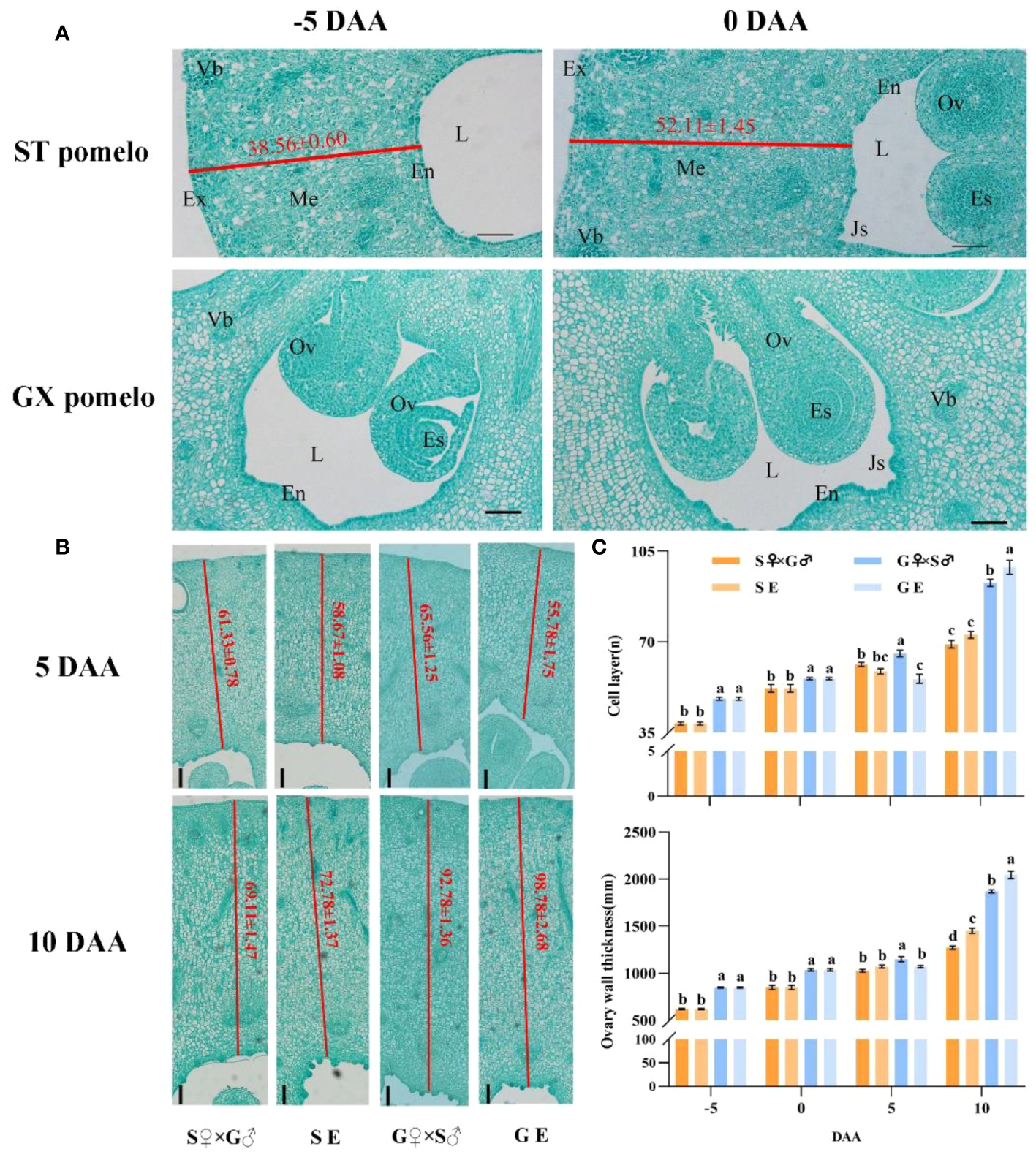 Time-course of cell growth from the ovary wall of S pomelo and G pomelo. (A) Cross-sction of the pomelo ovary at -5 and 0 DAA. En, Endocarp; Ex, Exocarp; Me, Mesocarp; Vb, Vascular bundle; Ov, Ovule; Es, Embryo sac; L, Locule; Js, Juice sacs. The values in red color indicate the numbers of the cell layers from the exocarp to the endocarp. (B) Ovary cell division at 5 and 10 days after cross-pollination (S♀×G♂ and G♀×S♂) and emasculation treatment (SE and GE). Scale bar: 0.1 mm. (C) Time-course analysis of the number of cell layers and ovary wall thickness. Values are means ± standard errors (SEs) of three ovaries. Different letters denote significant differences according to Duncan’s range test at p< 0.05.