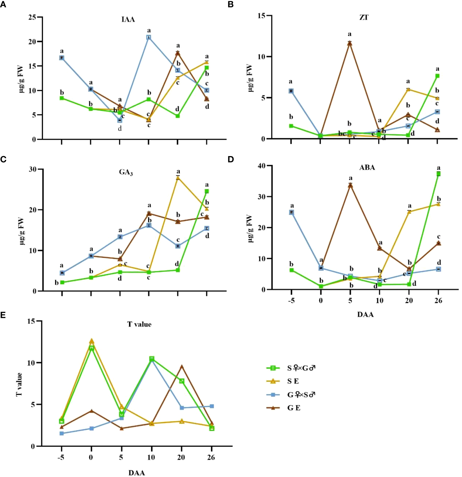 Dynamic changes of endogenous hormone contents and T values during early fruit development at -5, 0, 5, 10, 20, and 26 DAA after cross pollination and emasculation. (A) Indole-3-acetic acid (IAA) content. (B) Zeatin (ZT) content. (C) Gibberellic acid (GA3) content; (D) ABA content. (E) T value. Values are mean ± SEs of 3 biological replicates. Different letters denote significant differences according to Duncan’s multiple range test at p< 0.05.