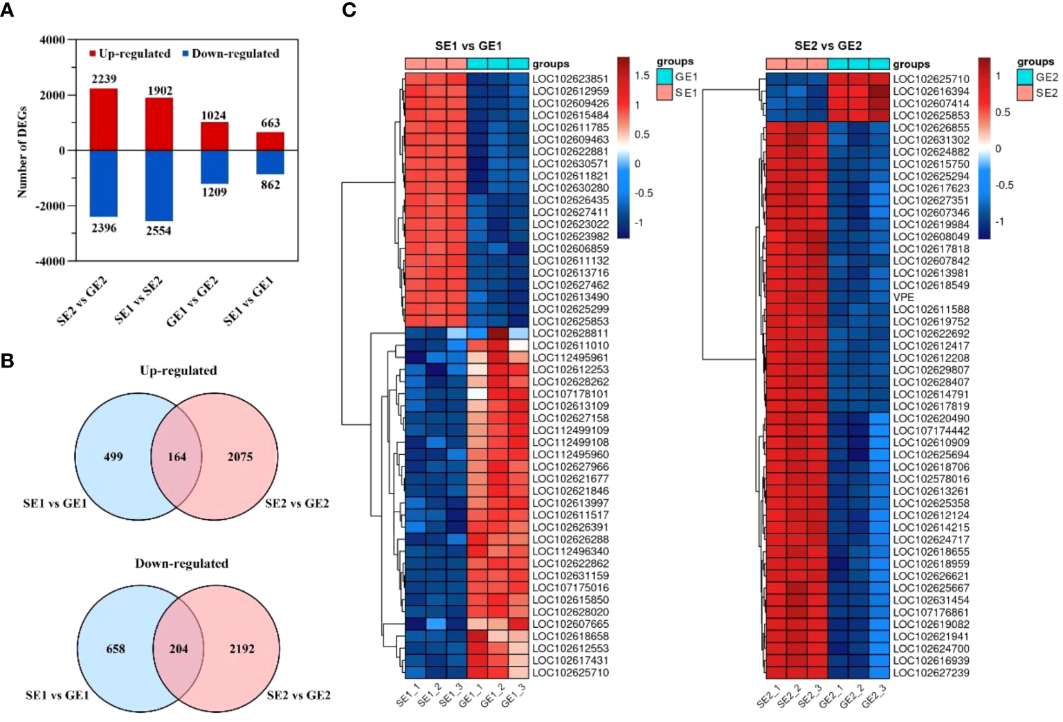 The number of DEGs in SE and GE ovaries at two critical development stage. (A) The total number of up-regulated and down-regulated DEGs at four comparison groups; (B) Venn diagram of up-regulated genes and venn diagram of down-regulated genes between SE1 vs GE1 and SE2 vs GE2; (C) Heatmap diagrams showing the relative expression levels of the top 50 DEGs with the smallest P values for the SE1 vs GE1 comparable group and the SE2 vs GE2 comparable group.