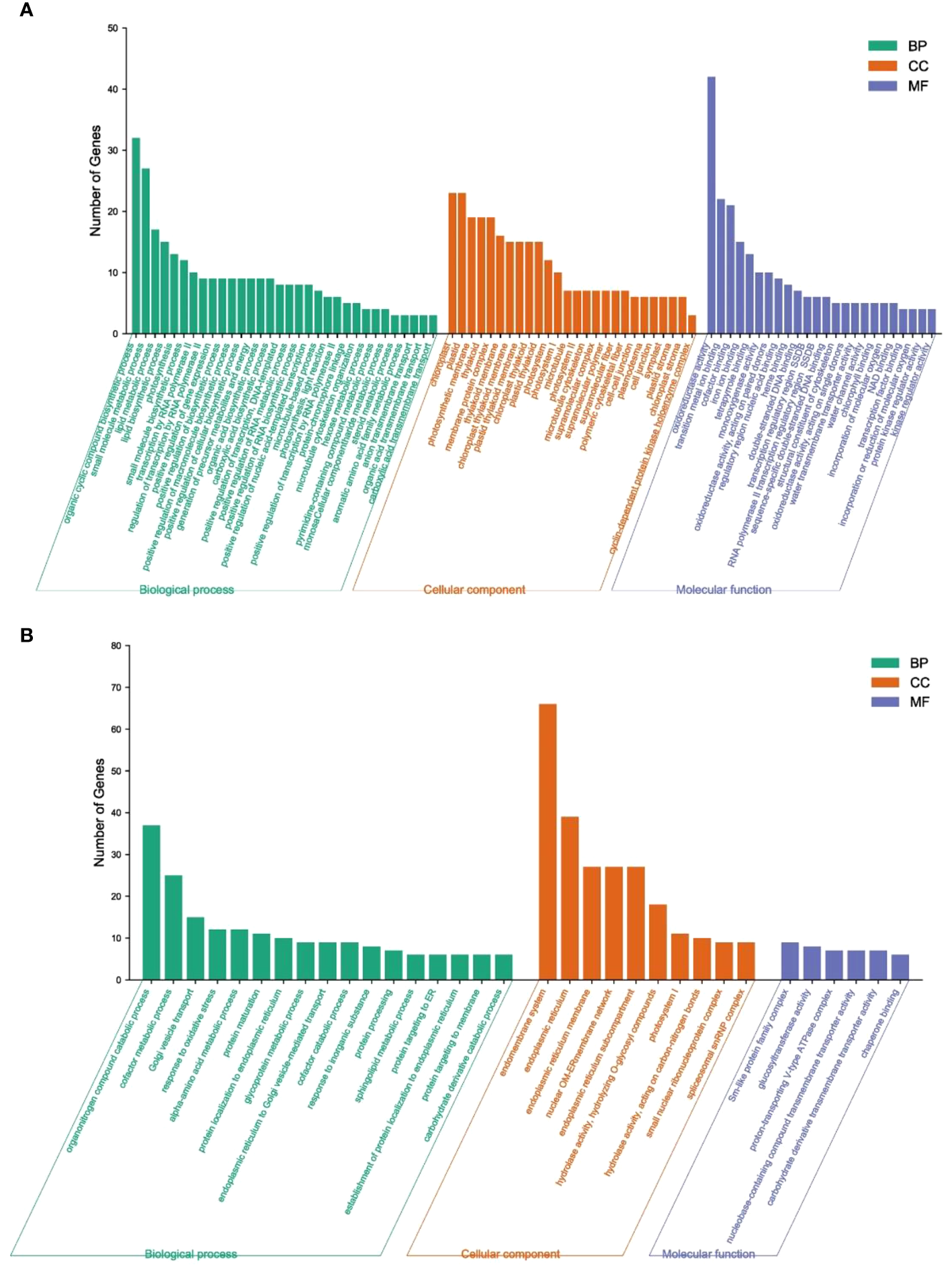 GO analysis of DEGs between SE and GE. (A) SE1 vs GE1; (B) SE2 vs GE2; BP, biological process; CC, cellular component; MF, molecular function.