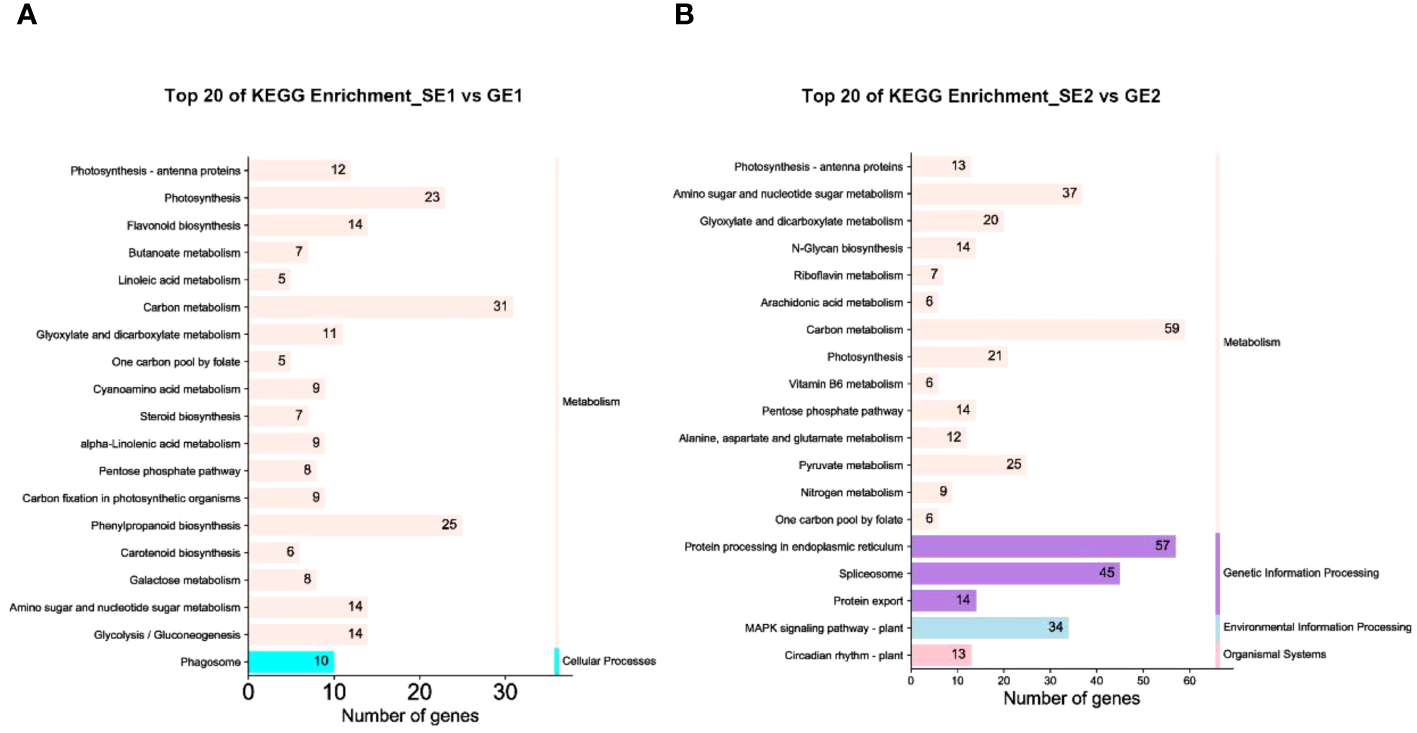 To further explore the key biochemical and signal transduction pathways involving the DEGs, we performed a pathway enrichment analysis using the KEGG database. As shown in Figure 6A, in the SE1 vs. GE1 group, a total of 227 DEGs were significantly enriched in two major metabolic pathways: “Metabolism” (with 217 members) and “Cellular processes” (with 10 members). As shown in Figure 6B, in the SE2 vs. GE2 group, a total of 412 DEGs were significantly enriched in four major metabolic pathways: “Metabolism” (with 249 members), “Genetic information processing” (with 116 members), “Environmental information processing” (with 34 members) and “Organismal systems” (with 13 members).