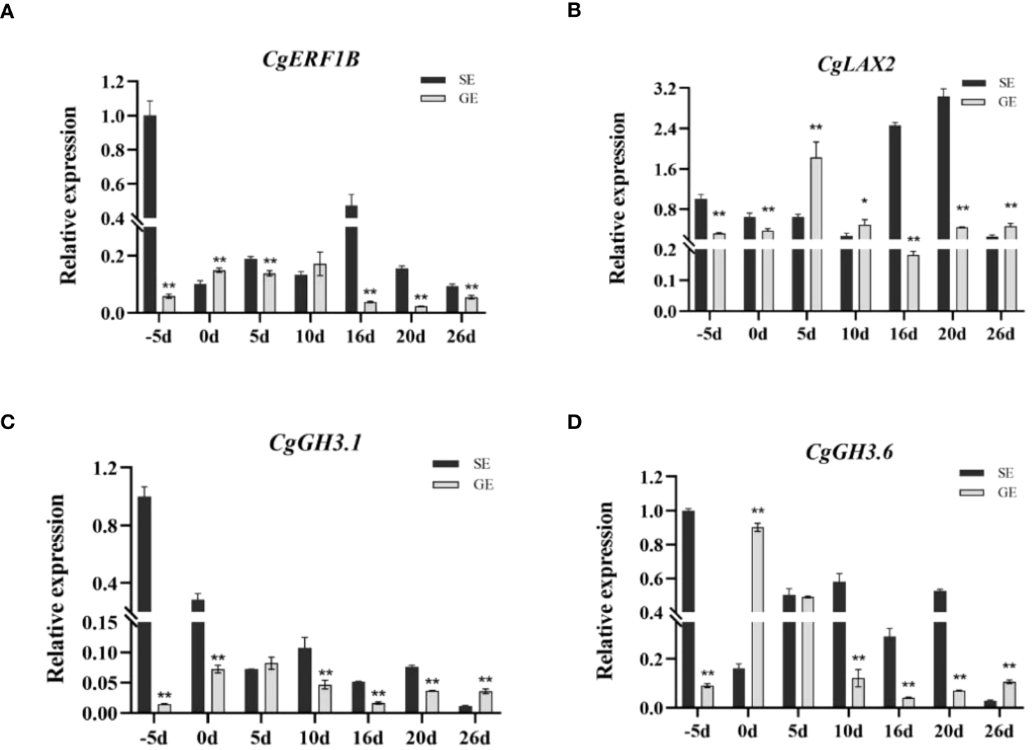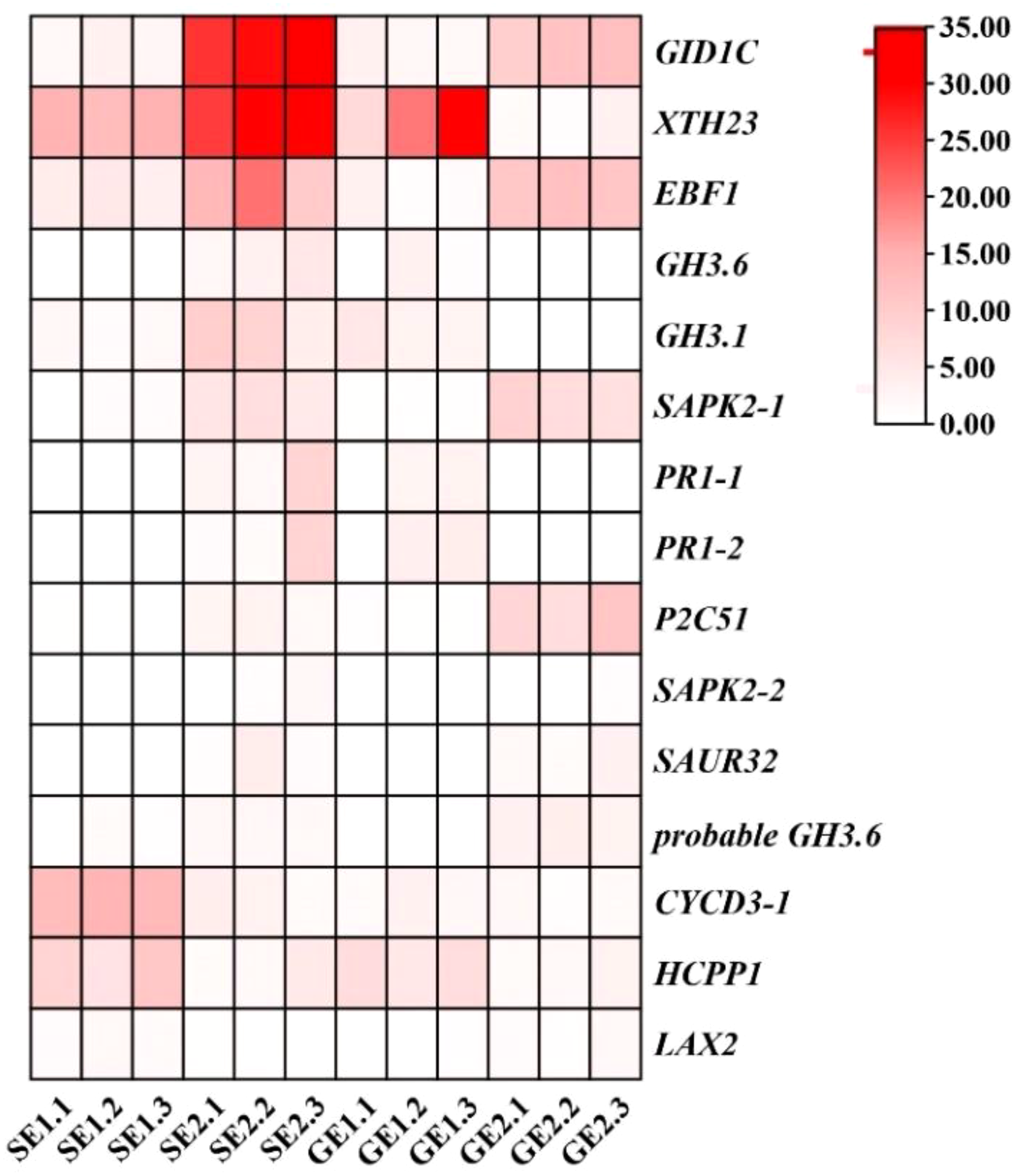 To validate the accuracy of the transcriptome analysis, 9 DEGs were randomly selected for quantitative real-time qRT-PCR analysis for comparison of their expression levels among four comparisons (SE1, SE2, GE1 and GE2) (Supplementary Figure S3). The correlation between the RNA-Seq and qRT-PCR results was analyzed using Excel 2019, revealing a highly significant correlation (r = 0.7859) between the qRT-PCR and RNA-Seq data (p<0.01) (Supplementary Figure S4). This result indicates that the transcriptome analysis was accurate.