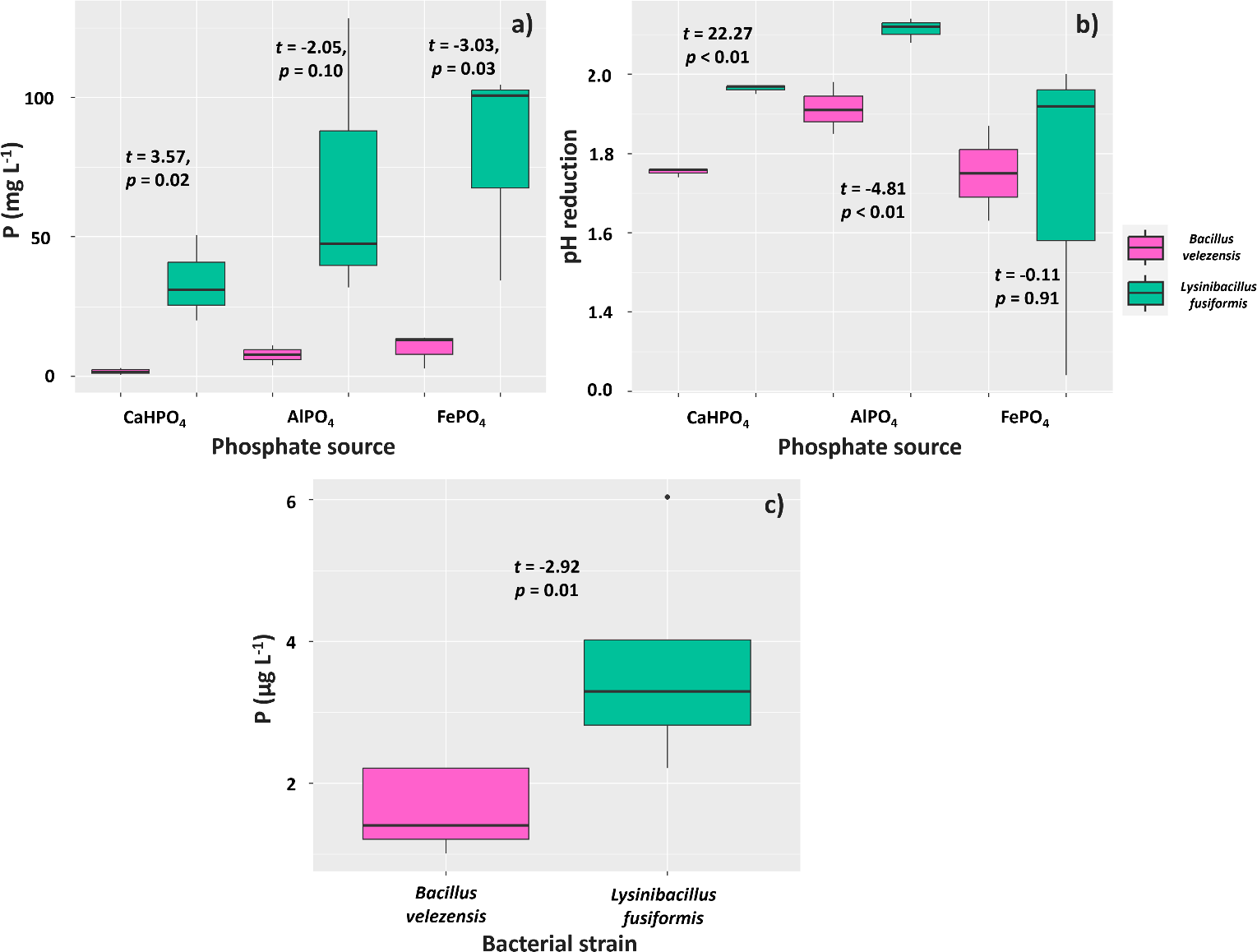 Solubilization of phosphate from CaHPO4, AlPO4 and FePO4 sources (A), culture medium pH reduction (B), and phosphate solubilization through phytase activity (C) by strains of Bacillus velezensis (BVPS01) and Lysinibacillus fusiformis (BVPS02). Data acquired 72 hours after incubation. Horizontal bars within boxplots represent the median of three replications per treatment. Values above the boxes were obtained using the Student’s t-test (p< 0.05).