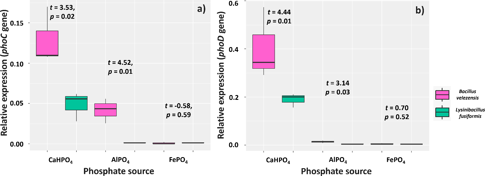 Relative expression of phoC (A) and phoD (B) genes in media containing CaHPO4, AlPO4, and FePO4 as phosphorus sources. Functional trait found for strains of Bacillus velezensis (BVPS01) and Lysinibacillus fusiformis (BVPS02). Data acquired 48 hours after incubation and normalized using the Eub gene as a reference. Horizontal bars within boxplots represent the median of three replications per treatment. Values above the boxes were obtained using the Student’s t-test (p< 0.05).