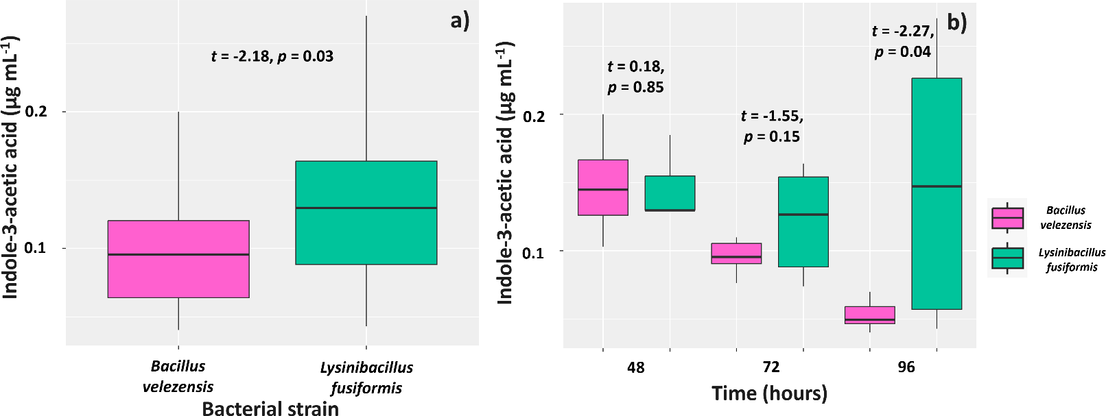 Synthesis of indole-3-acetic acid by strains of Bacillus velezensis (BVPS01) and Lysinibacillus fusiformis (BVPS02) (A) observed at 48, 72, and 96 hours of strain growth (B). Horizontal bars within boxplots represent the median of three replications per treatment. Values above the boxes were obtained using the Student’s t-test (p< 0.05).