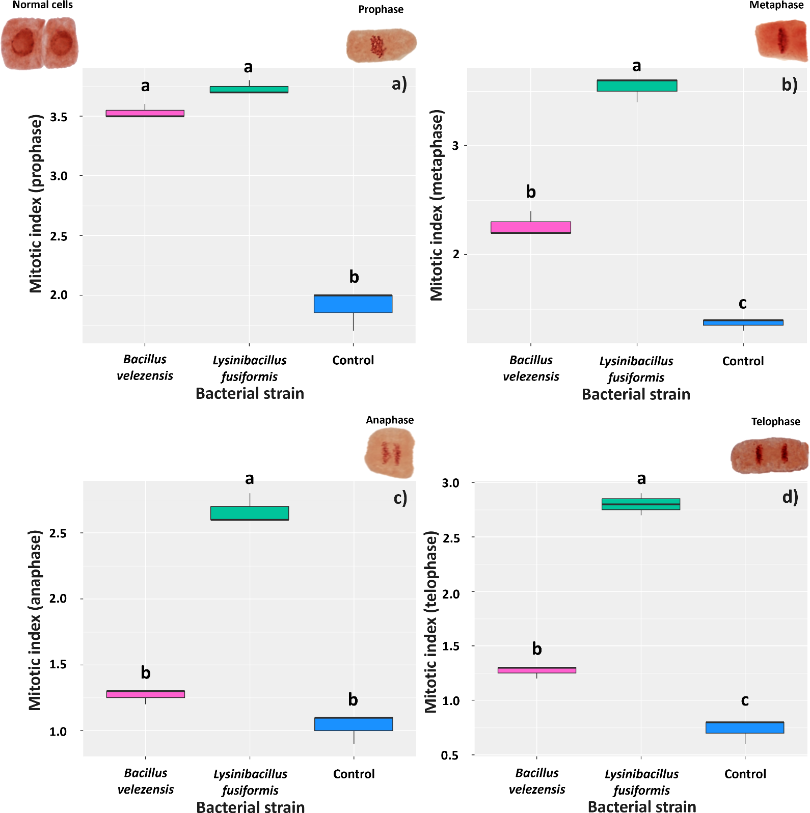 Mitotic index in meristematic cells of Glycine max roots at 6 days after inoculation with strains of Bacillus velezensis (BVPS01) and Lysinibacillus fusiformis (BVPS02). Index estimated for different phases of cell division: prophase (A), metaphase (B), anaphase (C), and telophase (D). Horizontal bars within boxplots represent the median of three replications per treatment (evaluation of 1,000 cells per replication). Boxes with equal letters are not significantly different by the Tukey’s test (p< 0.05). The images above the graphs are the different meristematic cells, representing the different phases of cell division.