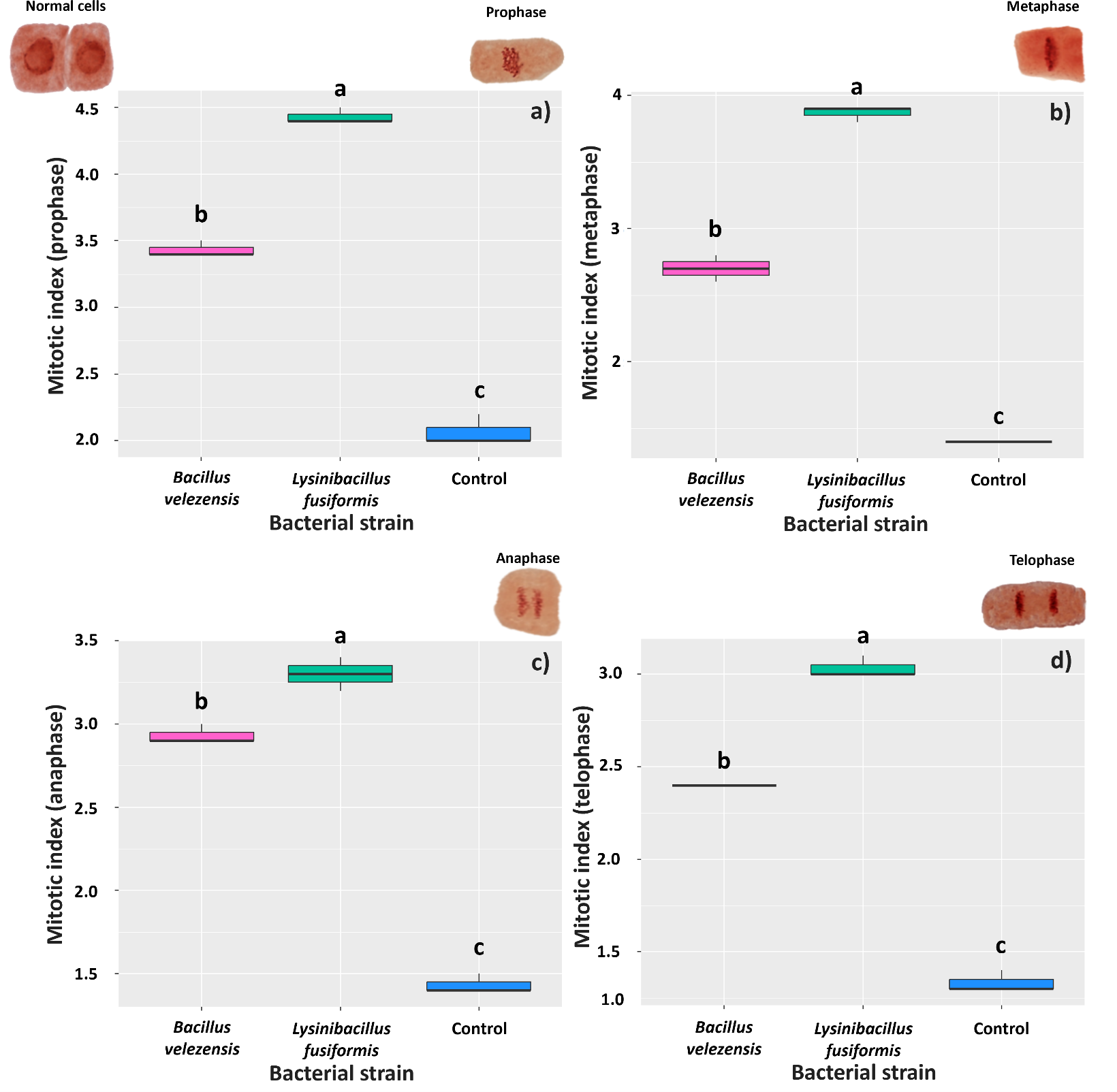 Mitotic index in meristematic cells of Glycine max roots at three days after inoculation with strains of Bacillus velezensis (BVPS01) and Lysinibacillus fusiformis (BVPS02). Index estimated for different phases of cell division: prophase (A), metaphase (B), anaphase (C), and telophase (D). Horizontal bars within boxplots represent the median of three replications per treatment (evaluation of 1,000 cells per replication). Boxes with equal letters are not significantly different by the Tukey’s test (p< 0.05). The images above the graphs are the different meristematic cells, representing the different phases of cell division.