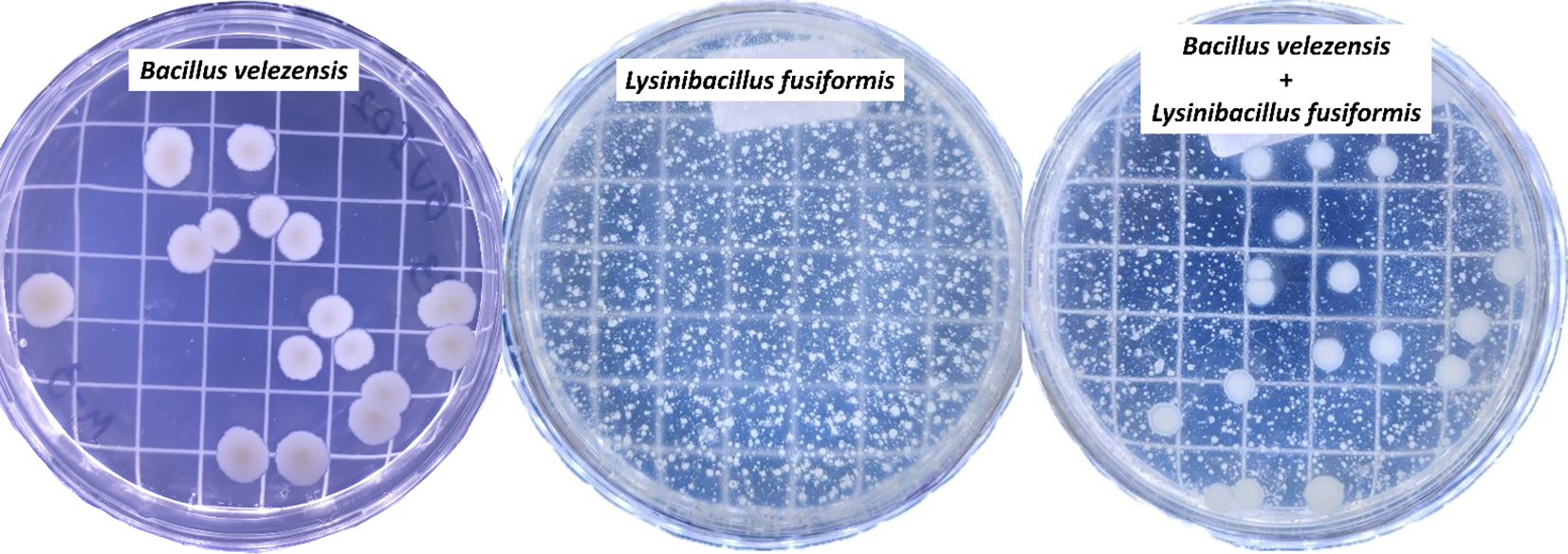 Biological compatibility between the strains BVPS01 (Bacillus velezensis) and BVPS02 (Lysinibacillus fusiformis). Individual plating of BVPS01, BVPS02, and plating of the biofertilizer consisting of the mixture of the two rhizobacteria (Bacillus velezensis + Lysinibacillus fusiformis).