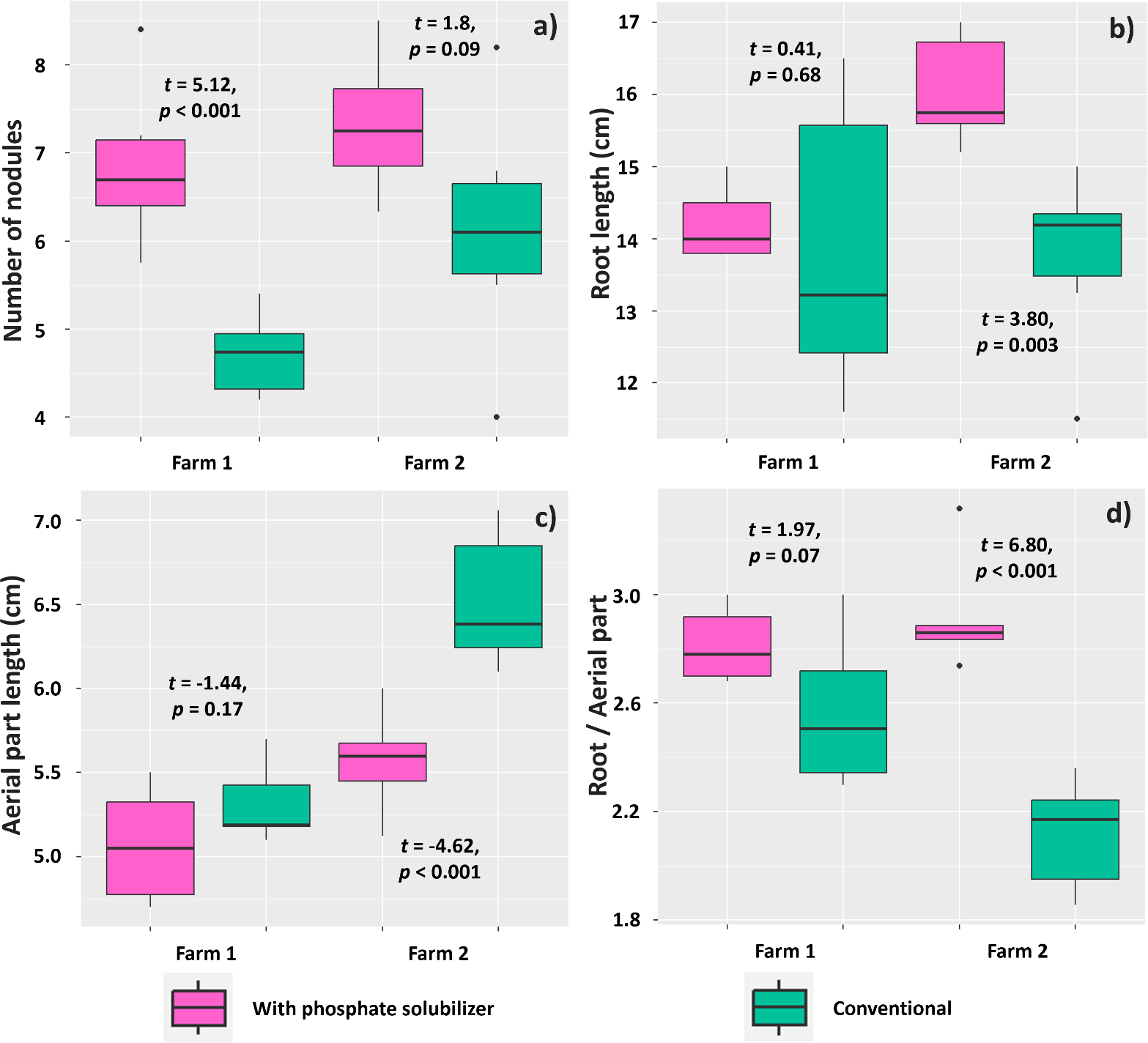 Mean number of flowers (A), nodules of 5–8 mm in diameter (B), and total number of nodules (C) in Glycine max plants subjected or not (conventional treatment) to inoculation of a biofertilizer based on phosphate-solubilizing rhizobacteria (Bacillus velezensis and Lysinibacillus fusiformis). Data acquired at 35 days after emergence in experiments conducted in 2 farms. Horizontal bars within boxplots represent the median of six replications per treatment. Points outside the boxes are outliers. Values above the boxes were obtained using the Student’s t-test (p< 0.05).
